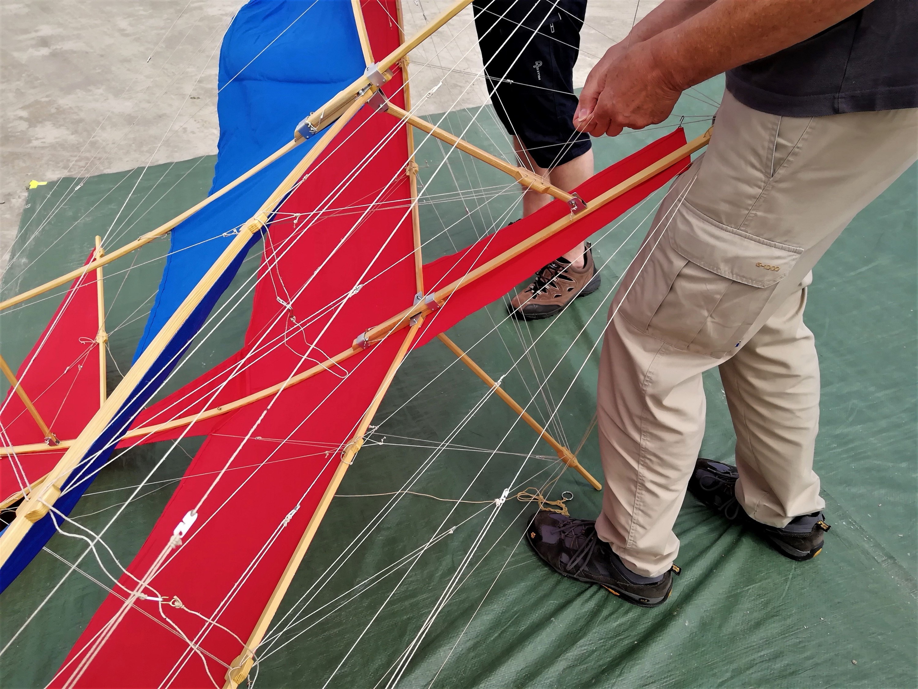 Ich bin gerade dabei meinen zu reparieren. Bei einer unsanften Landung in diesem Jahr auf Fanö, sind die beiden rechte Flügel gebrochen. Da ich nicht die gleiche Farbe der Stoffe bekomme, steht praktisch fast ein Neubau an