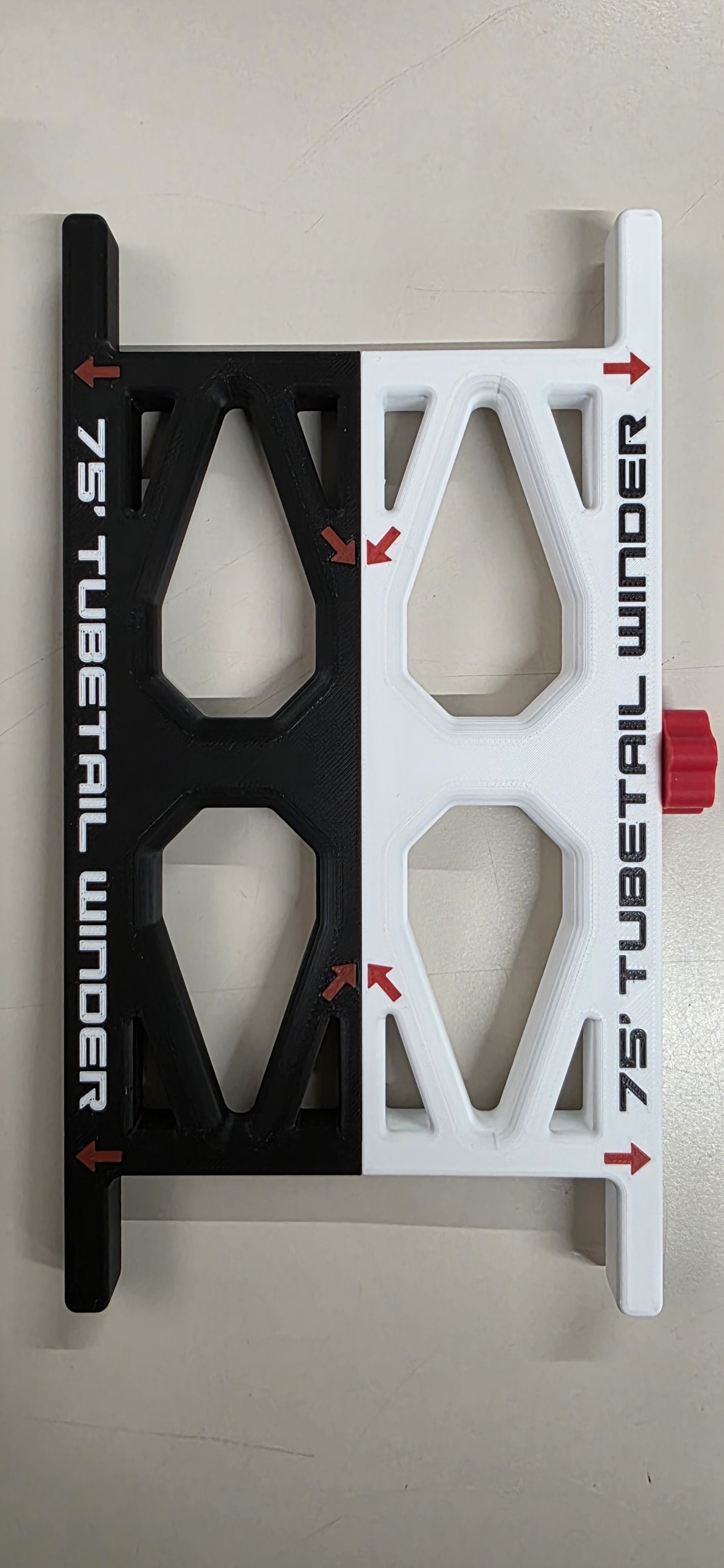 Der Winder lässt sich zusammenstecken und mit einer auch in 3D gedruckten Schraube justieren, damit die beiden Seiten sich nicht versehentlich beim Aufwickeln des tubetails voneinander lösen. Nach dem Aufwickeln einfach die Schraube bis zur Markierung lösen und die beiden einzelnen Seiten des Winders nach außen ziehen.