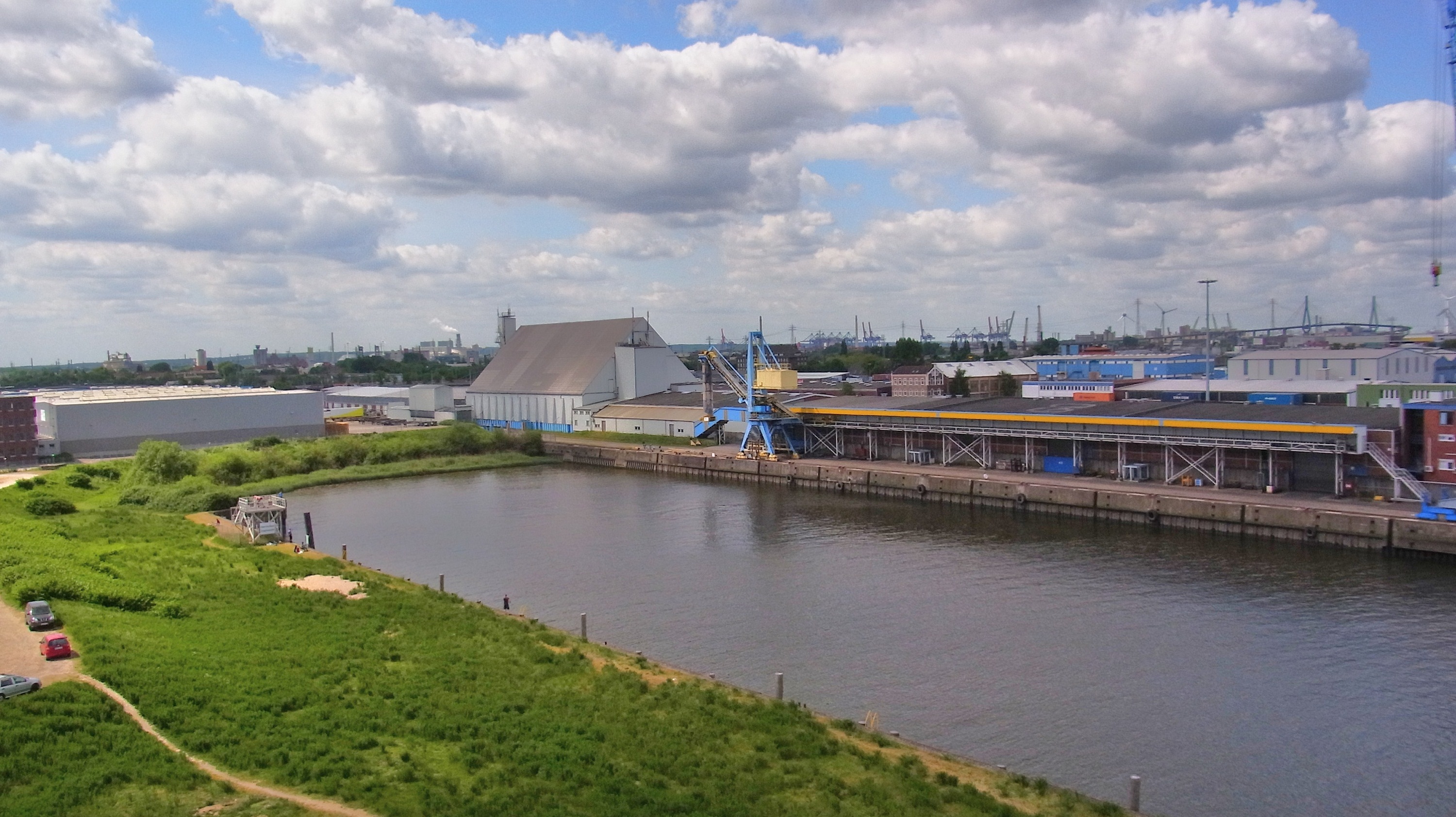 Rechts am Horizont ist die Köhlbrandbrücke zusehen.