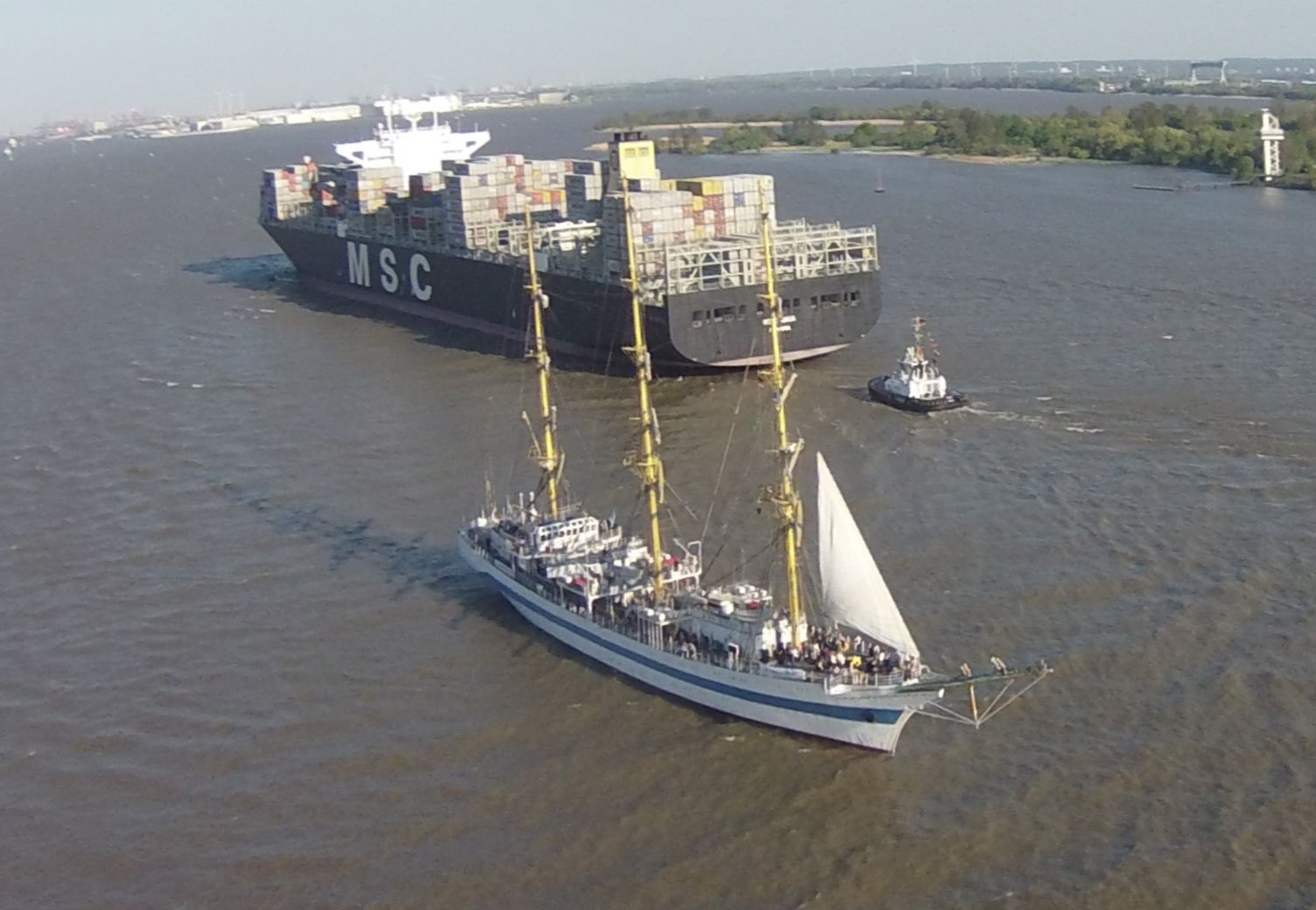 Das Ukrainische Segelschulschiff "Mir" begegnet einem Kontänerschiff der Reederei MSC nahe dem Anleger Wittenbergen in Hamburg. Trotz idealem Wind hat die Mir nur ein Alibi-Stagsegel gesetzt. An fehlender Crew kann es nicht gelegen haben... Obwohl Kontänerschiffe dieser Größe über Bug- und Heckstrahlruder verfügen wird es von einem Angstschlepper begleitet, um im Ernstfall nachhelfen zu können. Es herrschte viel Schiffsverkehr, starker Wind und vor wenigen Wochen war bereits ein Schiff auf Grund gelaufen. Aufgenommen aus ca. 60m Höhe mit "Fischauge"