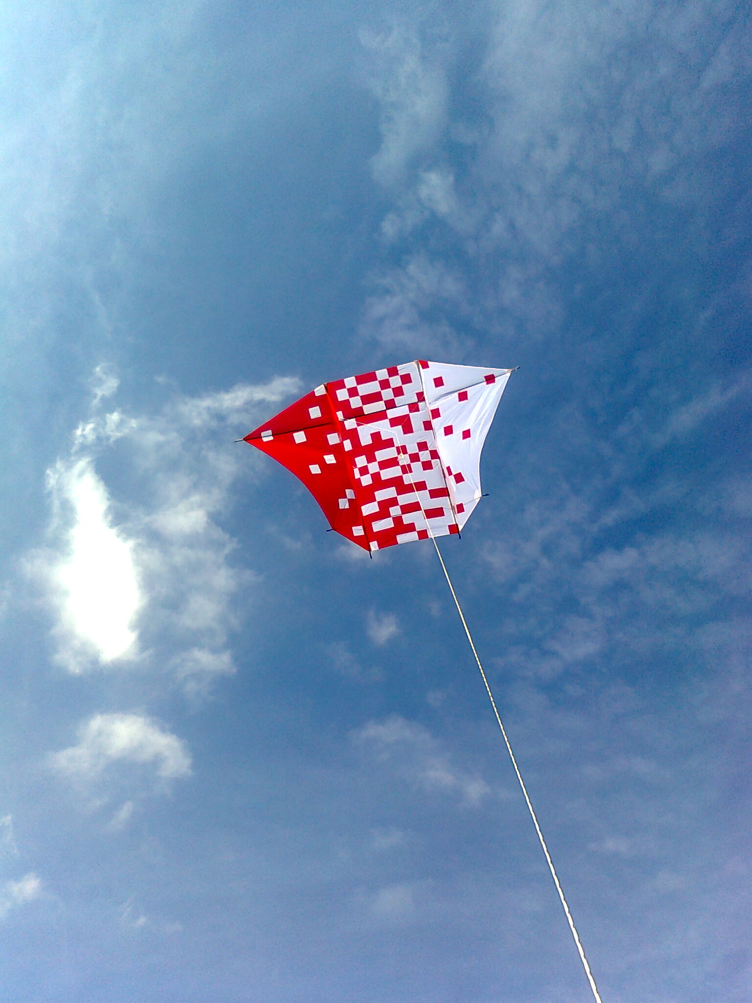 Flare von 2013 nach dem Bauplan von Pelham im Siebdruck-Design. Das Gestänge ist CFK Skyshark, das Tuch Fallschirmseide. Der Drachen ist für große Flughöhen (>1000m) ideal.