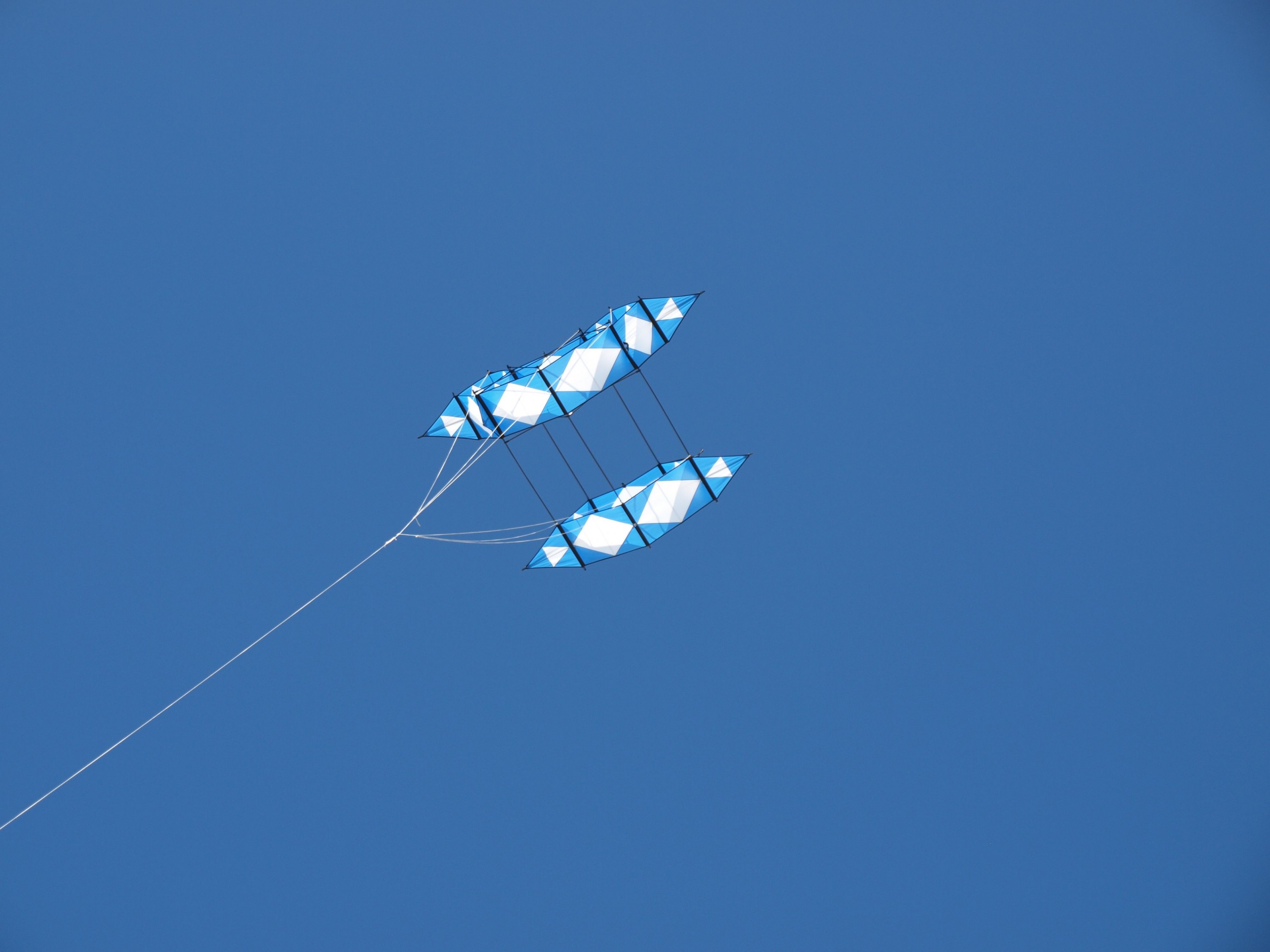 Man könnte den Drachen auch an einer Zweipunktwaage fliegen, da die hintere Zelle angewinkelt ist. Bei unruhigen Wind ist das aber trotzdem ein Risiko.