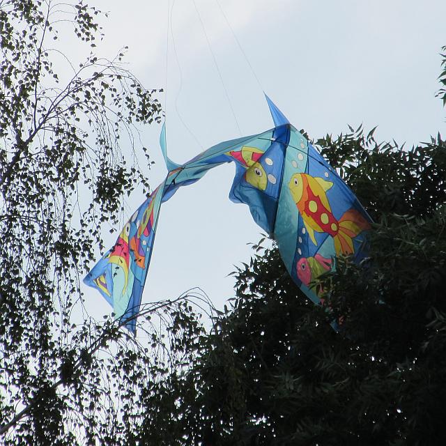 Bei diesem Genki war die Bergung nicht einfach. Der eingesetzte "Rabe Rudi"-Delta hatte wegen abflauenden Windes zu wenig Lift. Außerdem hatte sich die hintere Spannschnur des Genkis in den Zweigen verfangen. Letztlich half nur gezielte Gewalt: Die Spannschnur riss und der Genki konnte an seiner Flugleine heruntergezogen werden — ohne weitere Schäden am Drachen.