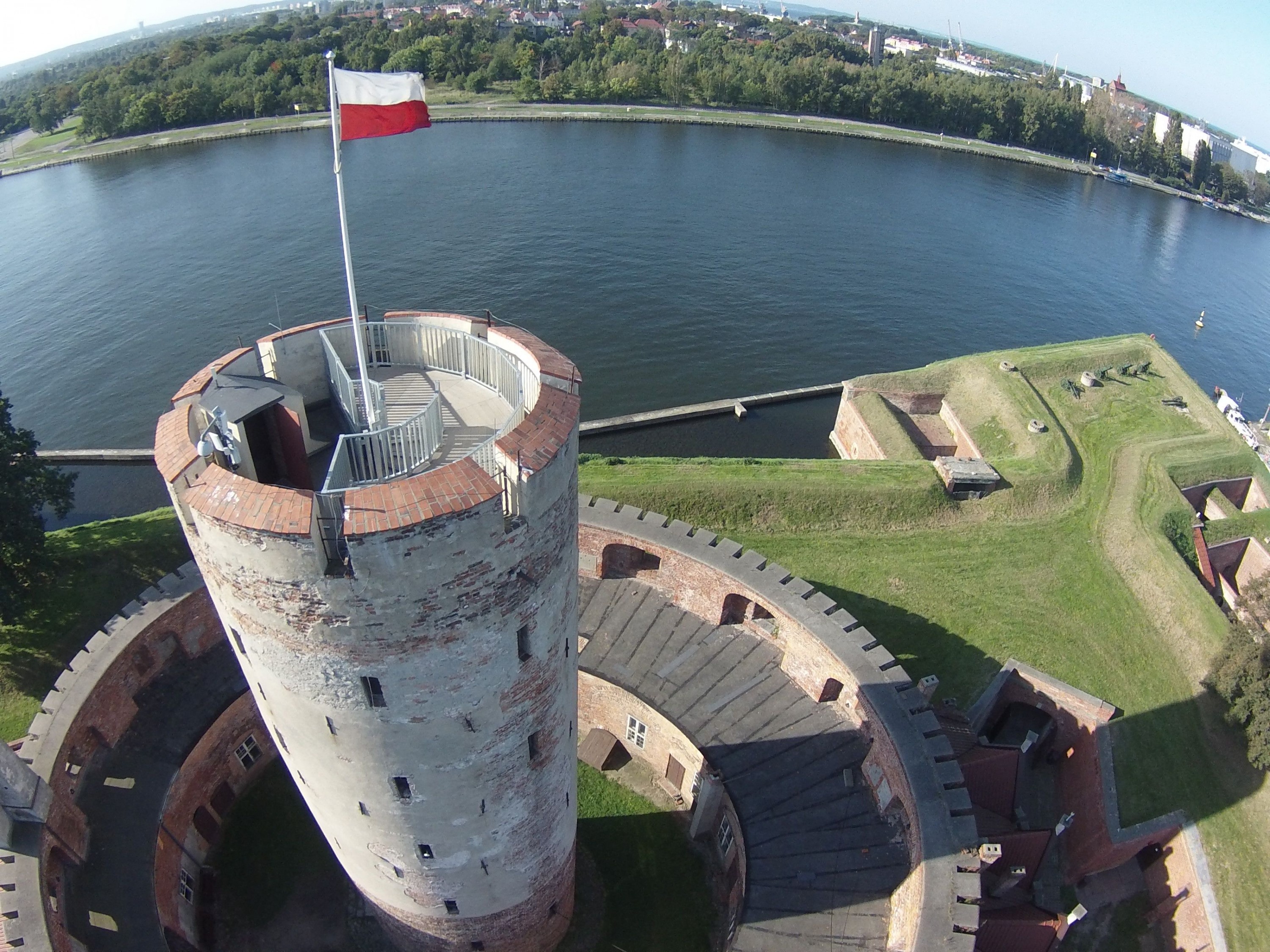 Der Turm der Festung Weichselmünde aus der Luft.