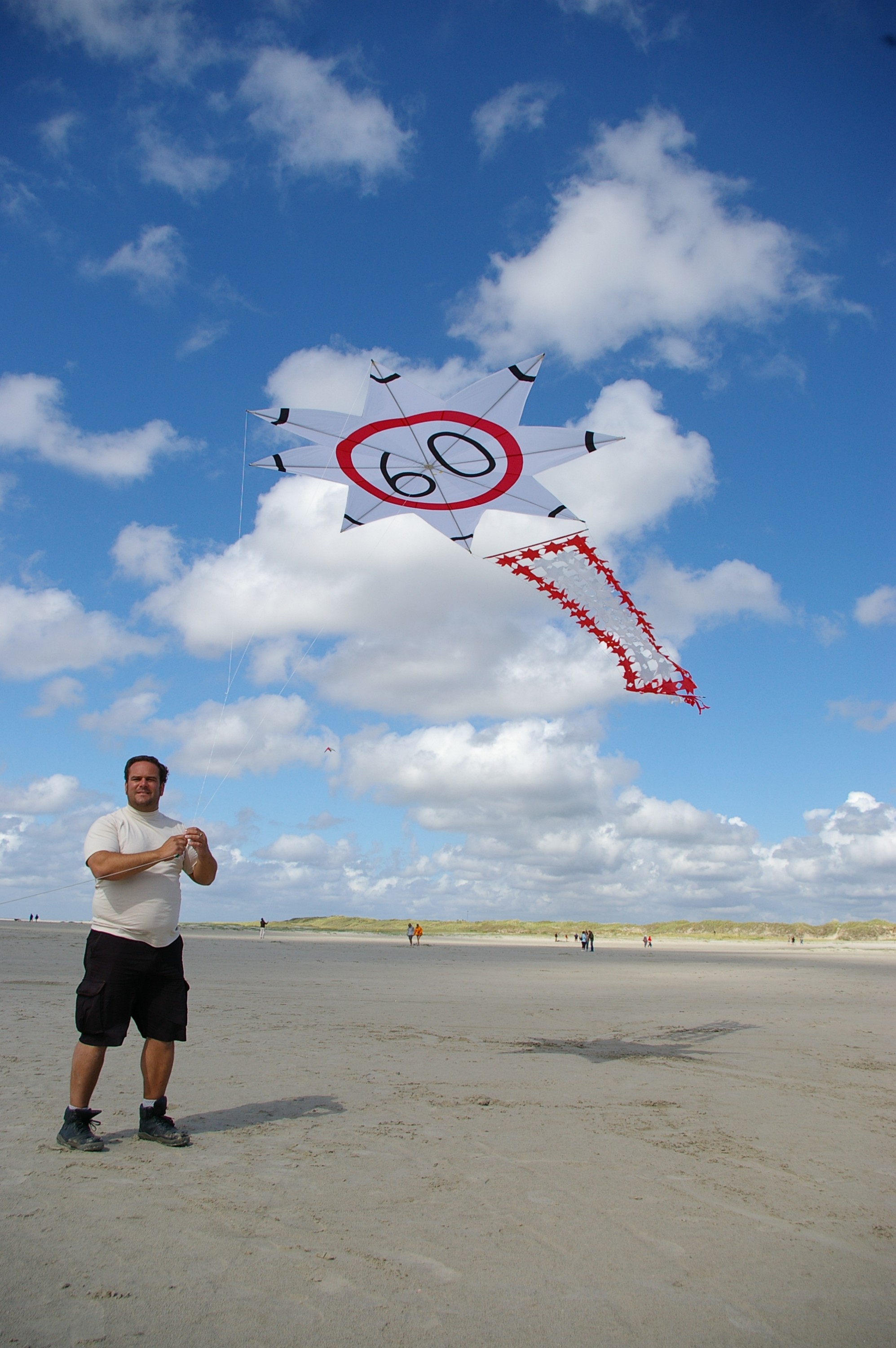 Sterndrachen zur freundlichen Erinnerung an Autofahrer.Gestänge ist 10er CFK, das Tuch Icarex.Die Sterne im Schwanz sind mit durchgehenden senkrechten Leinen verbunden. Super simpel!Aufnahme von 2008