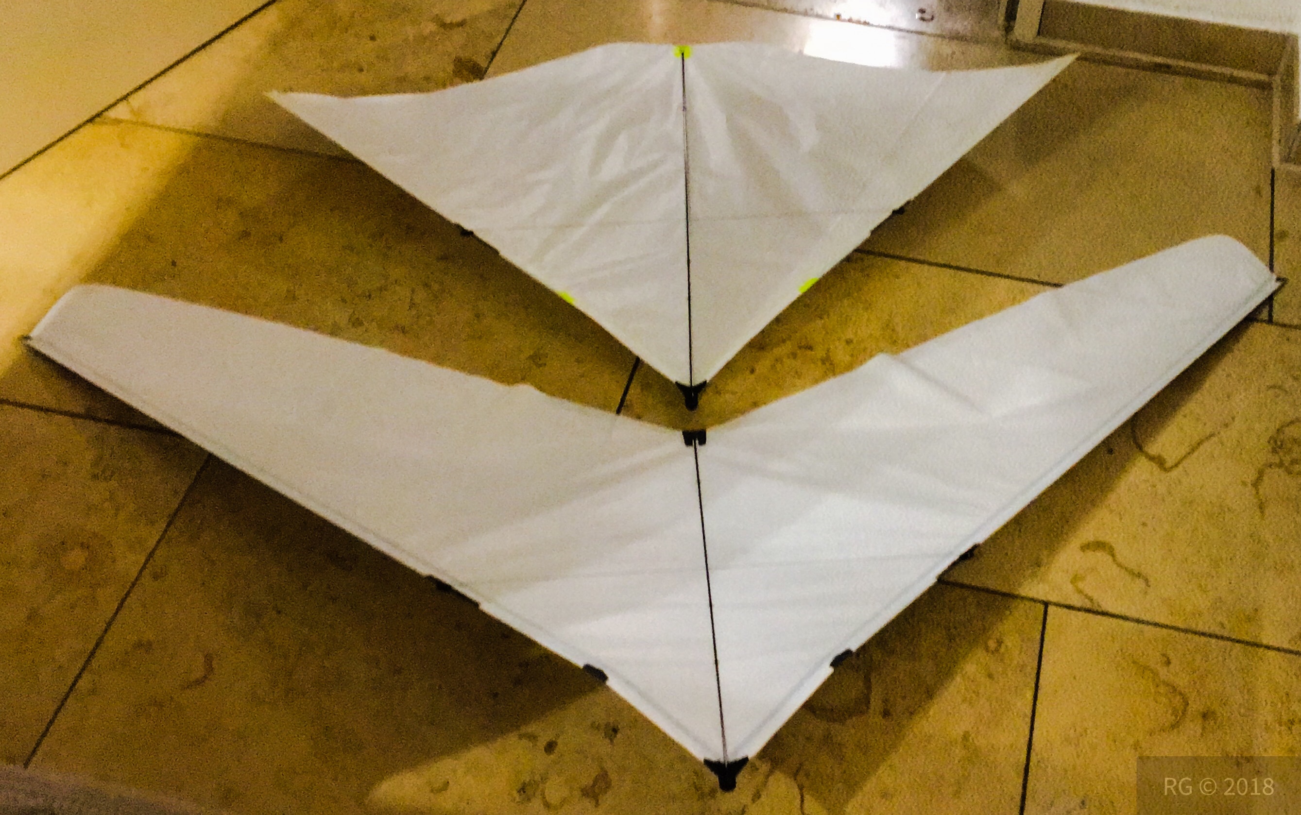 Bei schlechtem Wetter heute endlich mal den Sticky Wing (der Größere mit den schwarzen Streifen) gebaut! Gleitet im Wohnzimmer schon mal super!