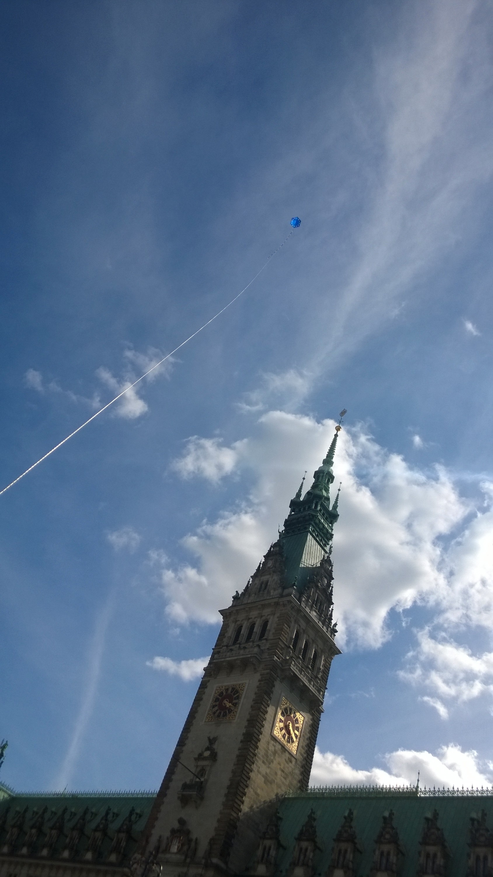Das war eine Herausforderung, aber es hat geklappt: Anlässlich einer Kundgebung habe ich meinen Rokaku auf dem Hamburger Rathausmarkt hochgelassen.