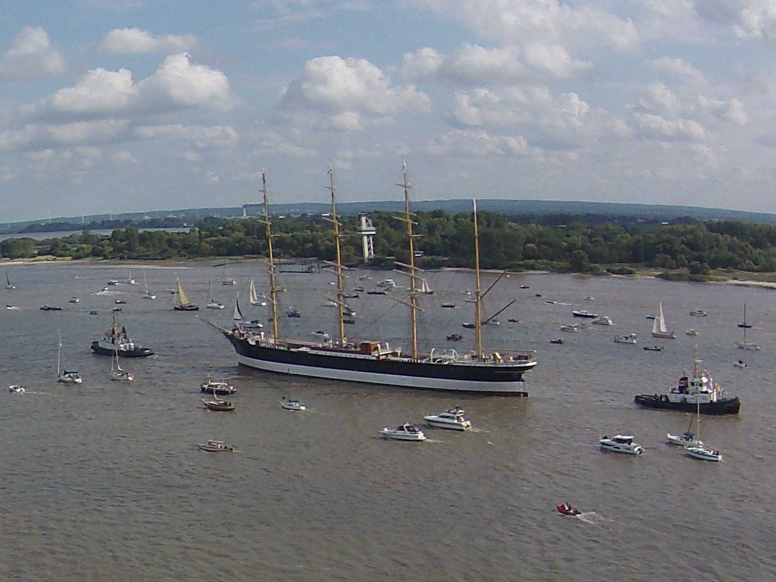 Die PEKING auf ihrer letzten Fahrt passiert den Fähranleger von Wittenbergen. Jede Nussschale hat ihr Geleit geboten.