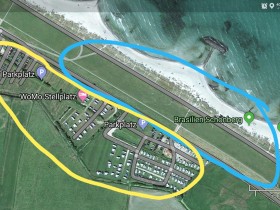 Zwei Womo-Stellplätze mit gesamt ca. 250 Plätzen finden sich direkt hinterm Deich! Tagsüber drachenfliegen und abends entspannt den Sonnenuntergang oder Musik/Feuerwerk beim Seebrückenfest genießen.