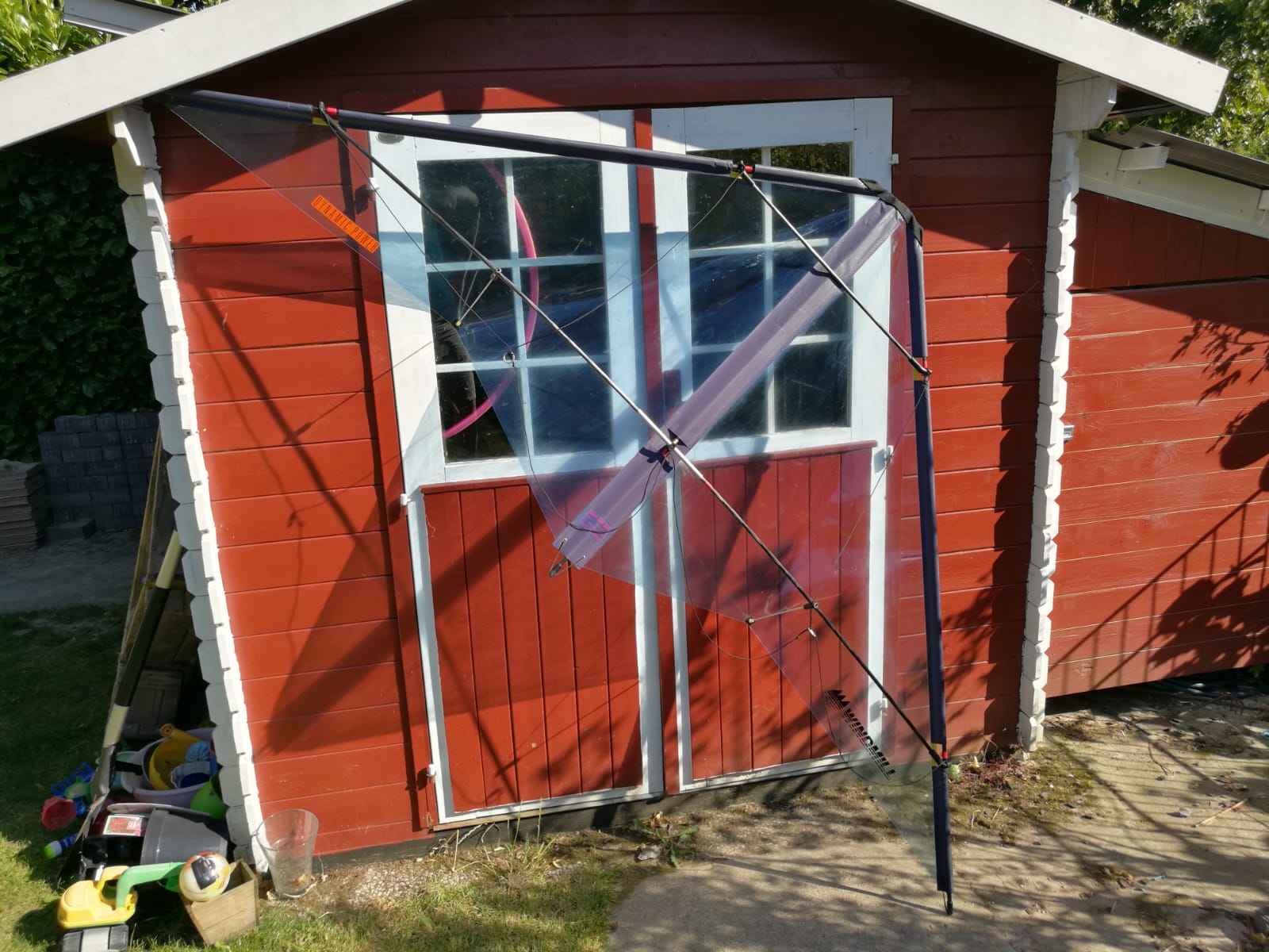 Ich habe heute einen Drachenoldtimer erstanden, etwas recht Ausgefallenes denke ich. Einen Drachen, der aus einer bläulichen Surfsegelfolie hergestellt wurde.