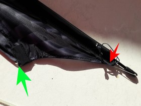 3. An der Tasche für das 2. Standoff an der Ecke der Schleppkante stösst man an. Dort kann man den Draht aber auch vorsichtig mit etwas Kraft weiterschreiben und kommt problemlos durch die Naht der Verstärkung (grüner Pfeil) raus.