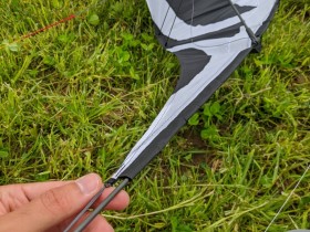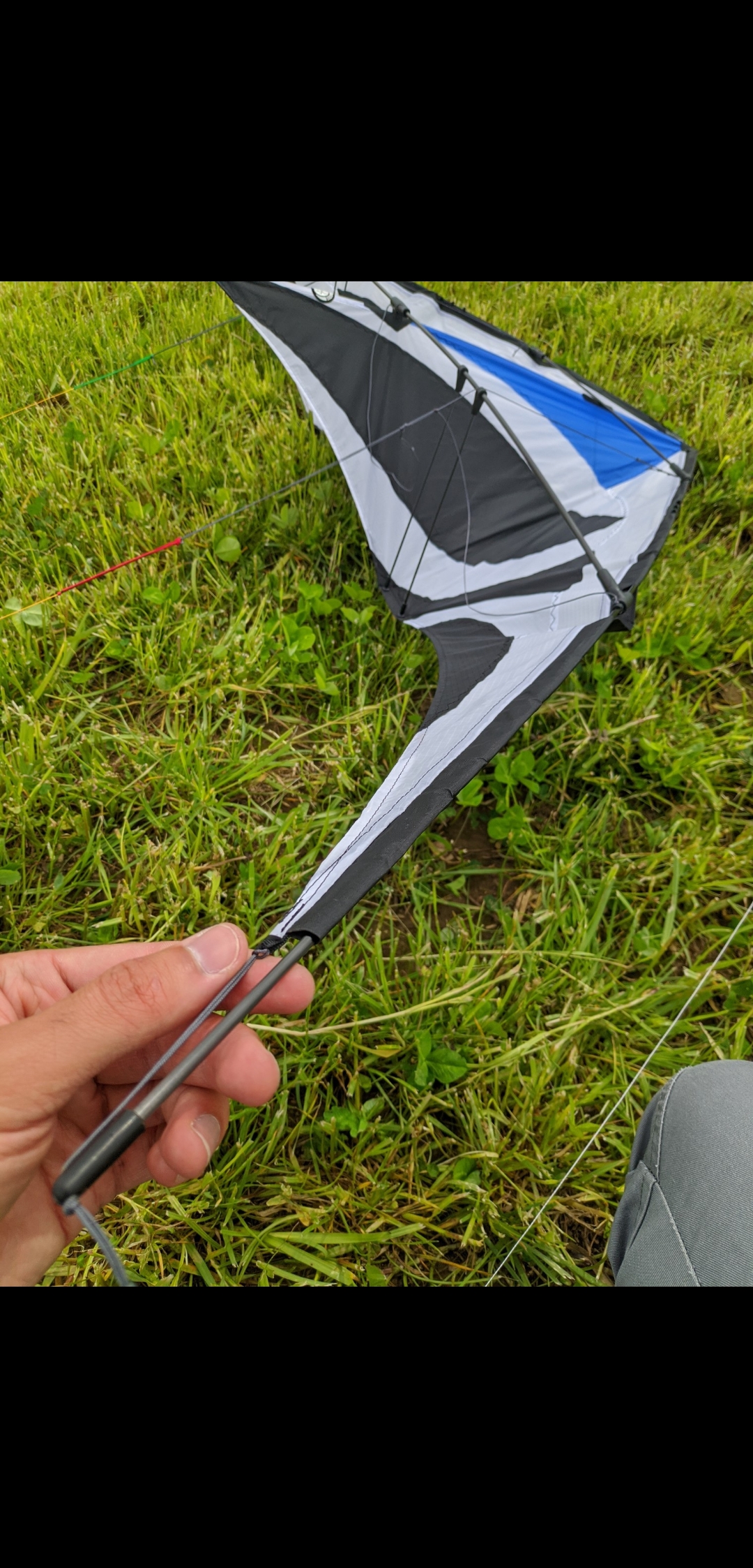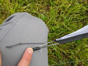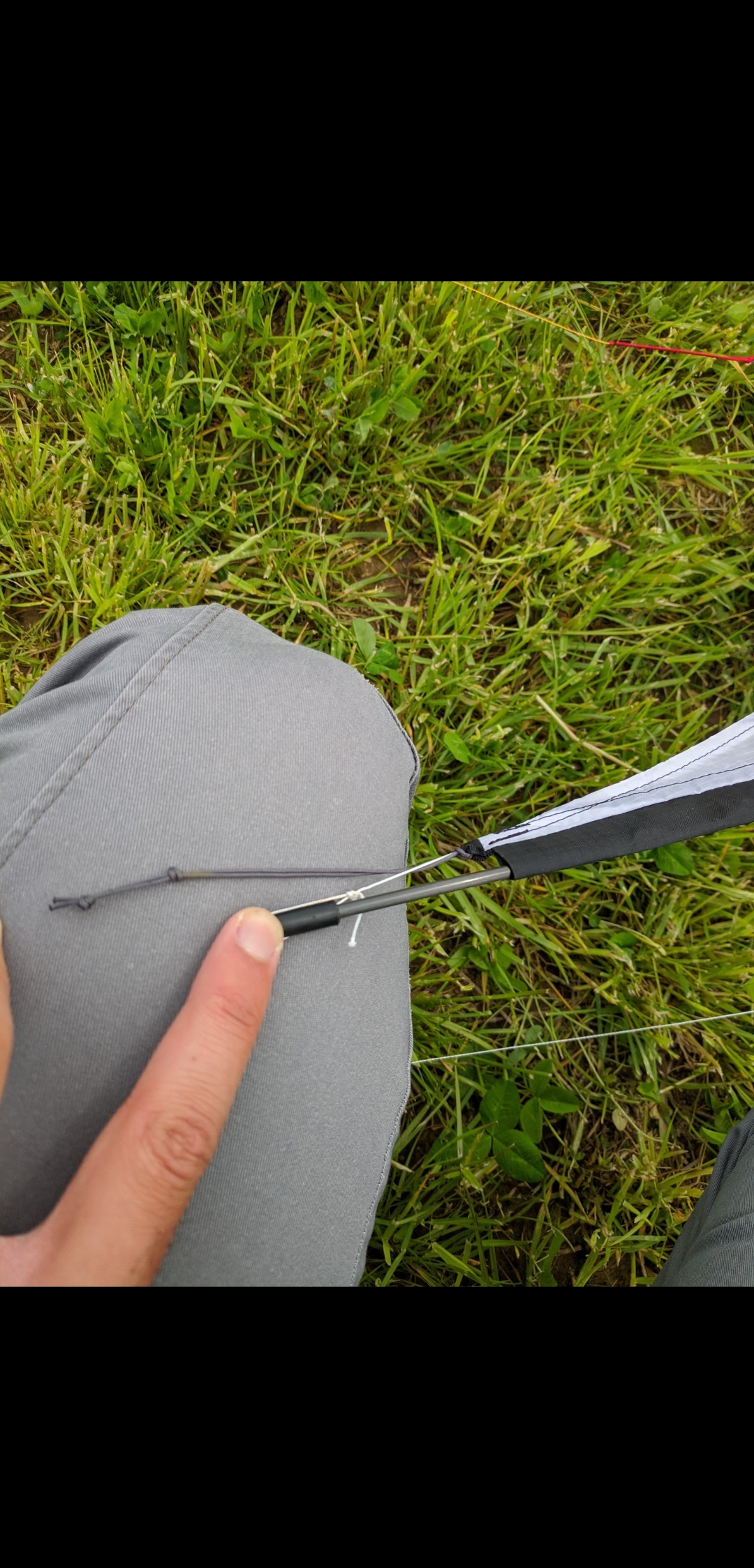Die normale Schnur der leitkante ist zu lang. Wenn ich sie einhänge dann ist gerade eben der Knoten auf Spannung. Aber es ist so wenig Spannung, dass es sich selbst während des Flugs lösen kann. Außerdem wirft das Segel dann Falten.