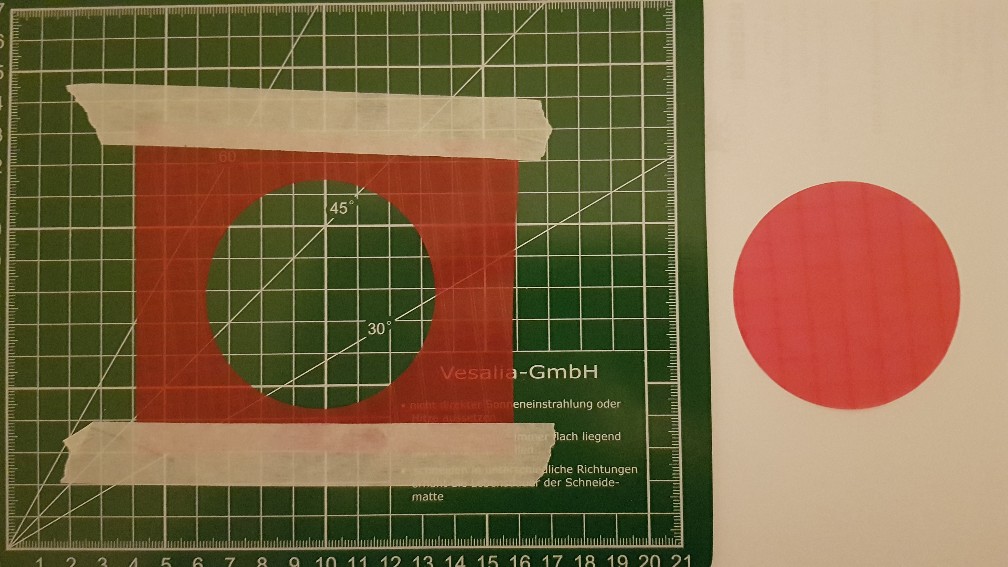 in der Größe vor (viereckig), klebe es mit Kreppband auf eine A4 Schneidunterlage, setzte Kreisschneider an,