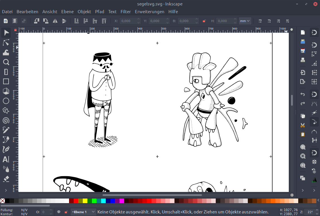 Um aber einen vernünftigen Druck in zu bekommen, in guter Qualität wollte ich die Graphiken als Vektorgraphik haben. Da konnte mir Devin leider nichts zur Verfügung stellen, also habe ich die Bilder von Instagram in Inkscape vektorisiert. Bei den konstrastreichen Skizzen ging das echt gut!