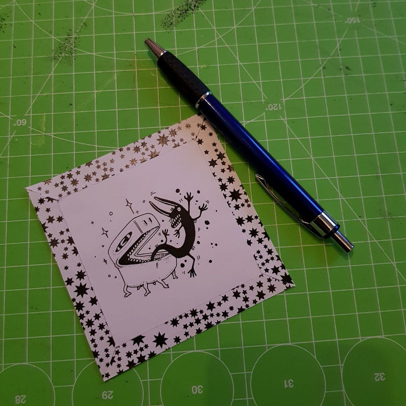 Nächstes Problem, ich will da noch was drum rum haben. einen Rahmen. Florian, von dem ich dieses mal viel klaue - ähm - inspiriert werde, hat einfache schwarze Rahmen um seine Cover genäht. Gute Idee, aber ist mir um die schwarz-weißen Skizzen zu langweilig.