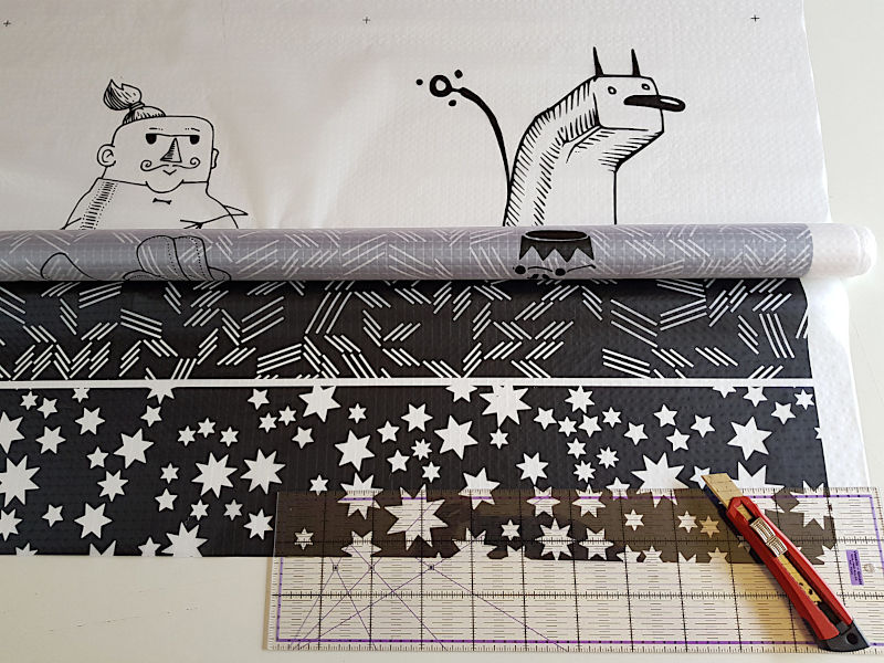 Erste Idee: Aus Ikarex um jede Zeichnung einen andersfarbigen Rahmen nähen. Doch im ersten Mockup sah das doof aus, irgendwie gewollt buntig, unpassend, doof! Schwarz oder weiß ist mir zu langweilig. Sieht ja aus wie Trauerrand. Das sieht bei den bunten Covern von Florians Kette toll aus, edel, passt einfach - schöner Kontrast. Aber bei mir - nee!