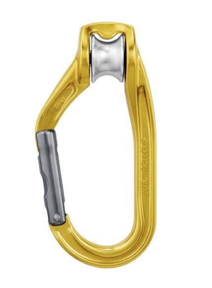 Das ist eine Kombi aus Karabiner und Rolle. Die Rolle ist kugelgelagert und der Karabiner