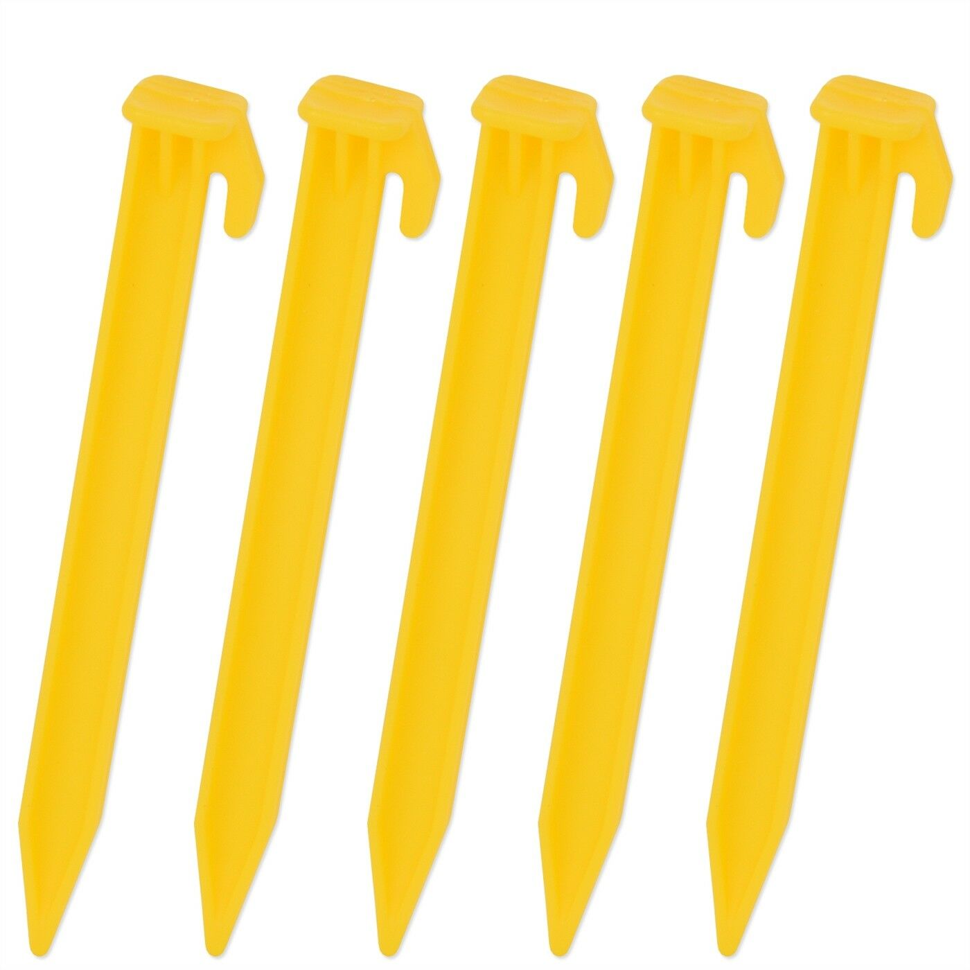 Ich benutze gelbe Kunststoff-Heringe, da ich die am Besten wieder finde.