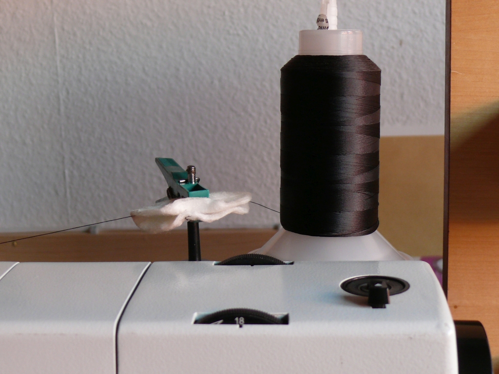 Die meisten Fadenöler, die ich kenne, sitzen vor den "Klemmscheiben" für die Oberfadenspannung. Aber ich kenne auch die Aussage "Der Fadenöler gehört hinter den Fadenspanner"...