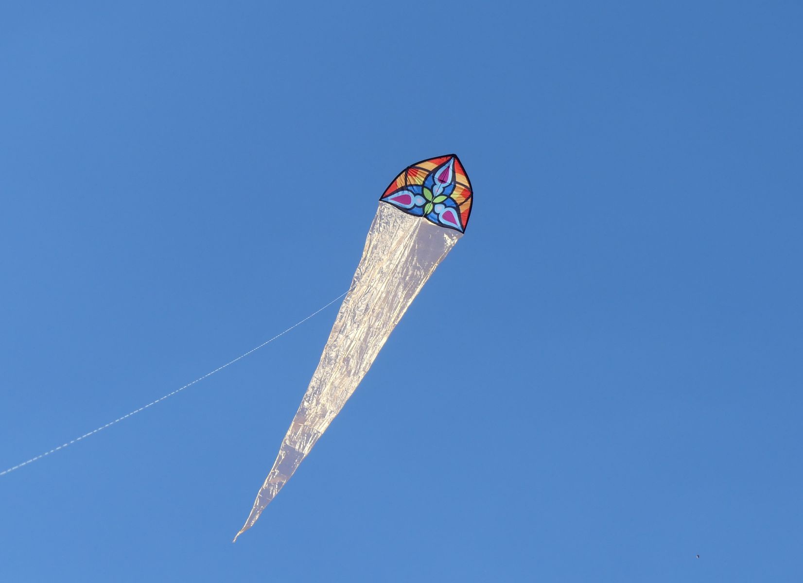 Der einzelne Drachen kommt mit einem stabilem Köcher und einer Leine auf einer Spule. Der Erstflug steht noch aus.