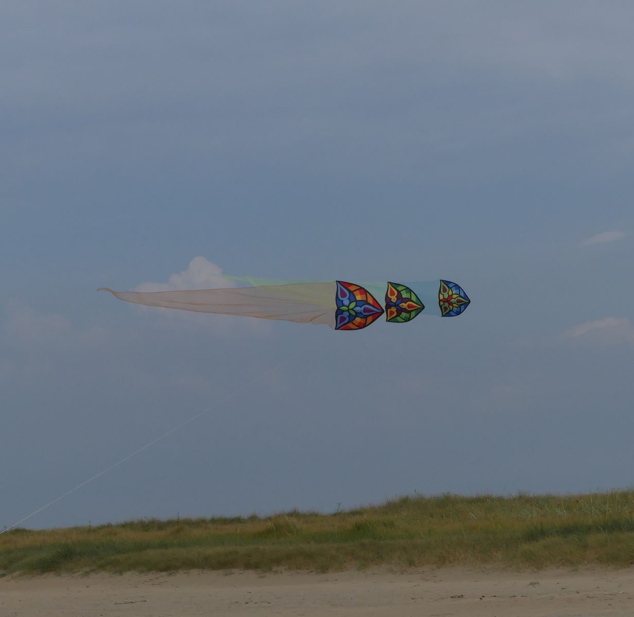 Die Drachen werden am oberen Waagepunkt verbunden. Die Waagen der beiden unteren Drachen stellt ihr etwas flacher, sodass sie nur in der Flugschnur "hängen". Dann steigt die Kette besser und zieht weniger.