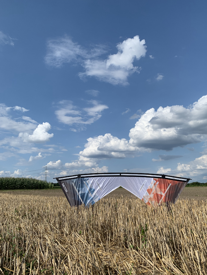 Heute Abend flog ich den Detox SUL. Ich war begeistert! Ich habe ja nicht die größte Erfahrung mit Vierleinern, aber von allen UL-Vierleinern, die ich bisher fliegen konnte, geht der Detox SUL mit Abstand am frühesten. Schon bei Windstille kann er mit etwas Armarbeit und ein paar langsamen Rückwätsschritten geflogen werden. Kaum spürt man etwas Wind im Nacken, schon fliegt er stabil (ich nutzte ein Set Laser Pro Gold von Fliegertak mit 50 lbs). Es war faszinierend, wie der Kite dann gaaanz langsam im Slide hin und her schwebte... Sehr meditativ und entspannend in der Abendsonne