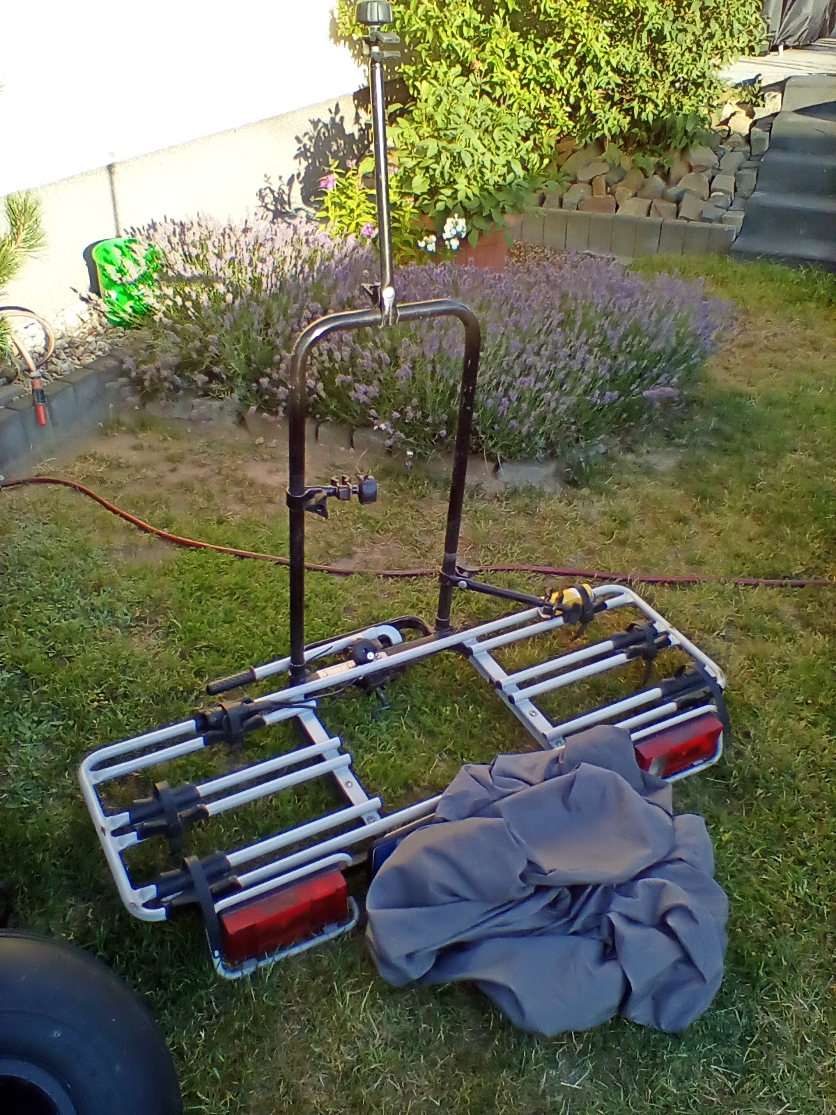 Hi! Habe da zuletzt für meine Römö-Pfingst-Tour auch ein bischen gebastelt. Meine Hinterachse steht jetzt auf nem Fahrradträger. Aufs Dach hab ich zwei Dachgepäckträger im Abstand von 30cm geklemmt. Daran ist eine Rohrkunstruktion angeschraubt, die sich über einen Drehpunkt nach vorne klappen lässt damit die Heckklappe auf geht wenn kein buggy dran ist.