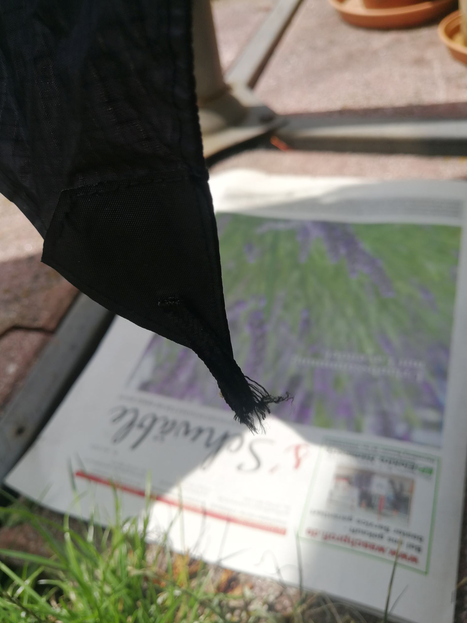1. Das gerissene Teil abtrennen, indem ich mit nem Nahttrenner die Befestigunfsnaht aufmachen würde .