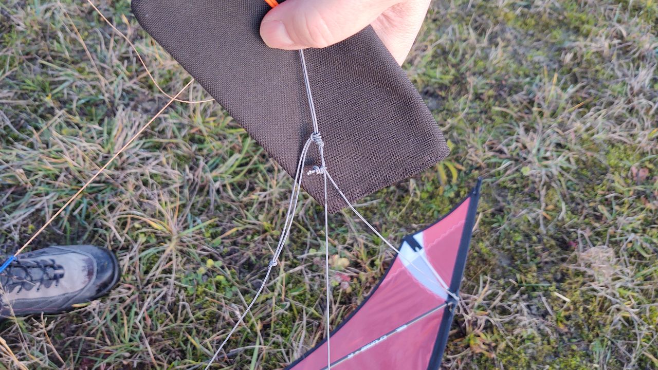 Fluggeräusch: leises Pfeifen. Beim starken manuellen Durchbeschleunigen wurde er lauter, dies hörte sich nach Tuchgeräusch und nicht nach der Schleppkante an. Steiler gestellt war das (nicht störende) Geräusch weg. Die Saumschnur endet übrigens innen vor dem Whisker, s. unteres Foto, so das die Jetecken ohne Saumschnur sind. Ob das bei viel Wind zu Geräuschen führt, bleibt abzuwarten.