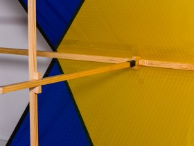 Die Länge der Querspreizen wurde erst ganz zum Schluss mittels Feilen exakt so eingestellt, dass die Spreizen "gerade so" in die Aufnahmen gedrückt werden können, um maximalen Druck auf die Bespannung zu geben. Nachdem ich beim allerersten Zusammenbau im Feld dann gleich mal eine meiner Querspreizen zerbrochen habe, habe ich die Spreizen im Mittelbereich mit GFK-Gewebeband verstärkt.