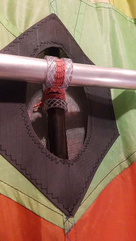 Bei den ersten Flügen bei wirklich unterer Windgrenze von 1-2 bft hat sich die Alumuffe im Kreuz bei meinem Flaki stark nach vorne gebogen und bei Micha ist das Alurohr einfach abgeschärt. Also der Drache wird im Bereich des Kreuzes und der Mitte der UQS sehr stark nach hinten belastet. Seid Umrüstung auf Edelstahl ist alles gut. Und hey, di paar Gramm machen bei der Größe nichts aus.