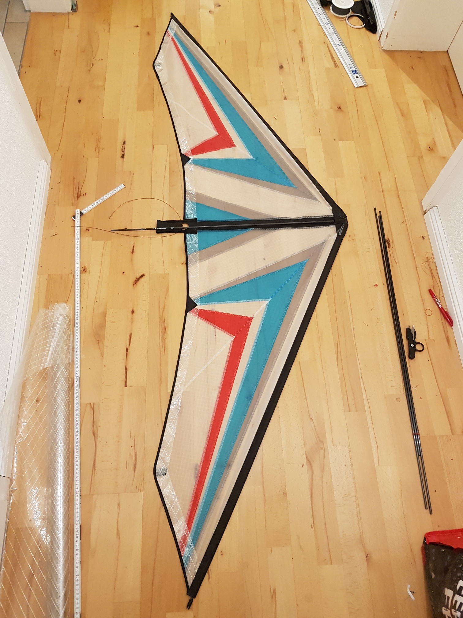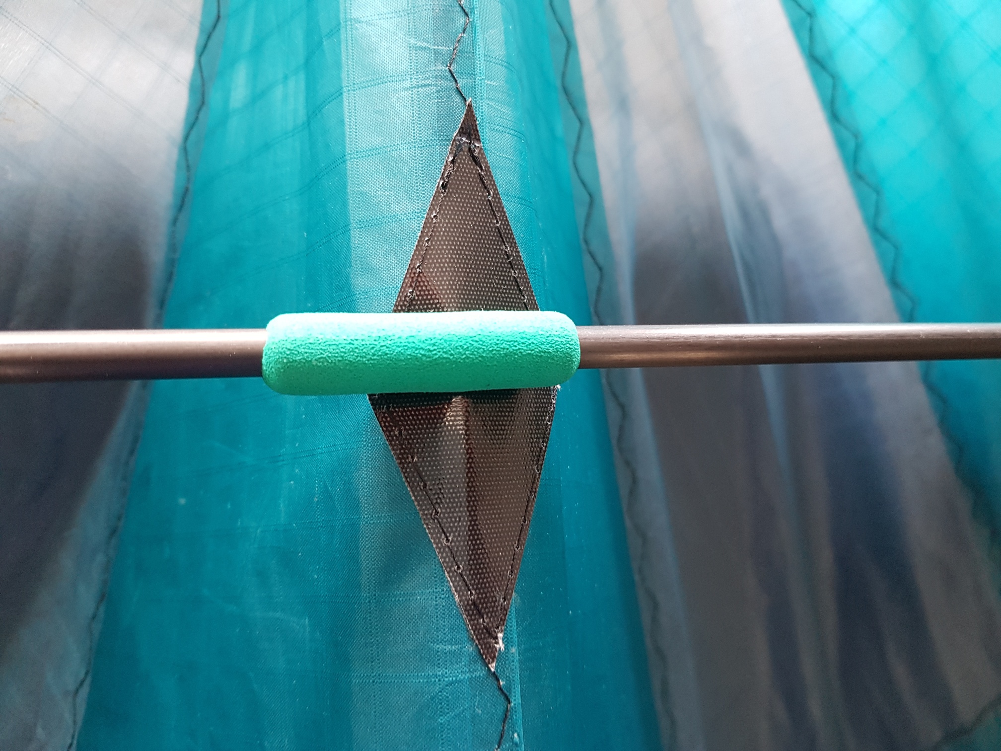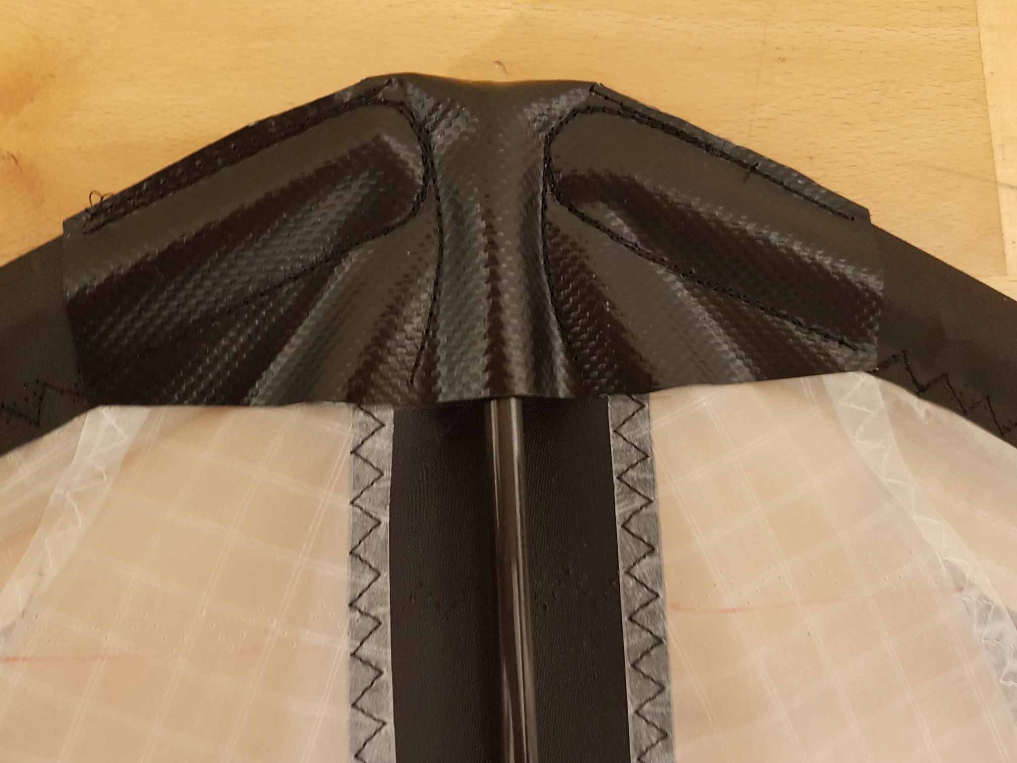 Hau das gesamte Dacron raus und ersetzt es durch Weisses vom Händler deines Vertrauens und wenn noch Reste vom weissen Icarex da sind schneide einen 2-3cm breiten Streifen maximaler Länge aus und verwende den als Schleppkantensaumband oder bestell einfach beim Händler deines Vertrauens weisses 25mm Spinnackersaumband und nimm das.