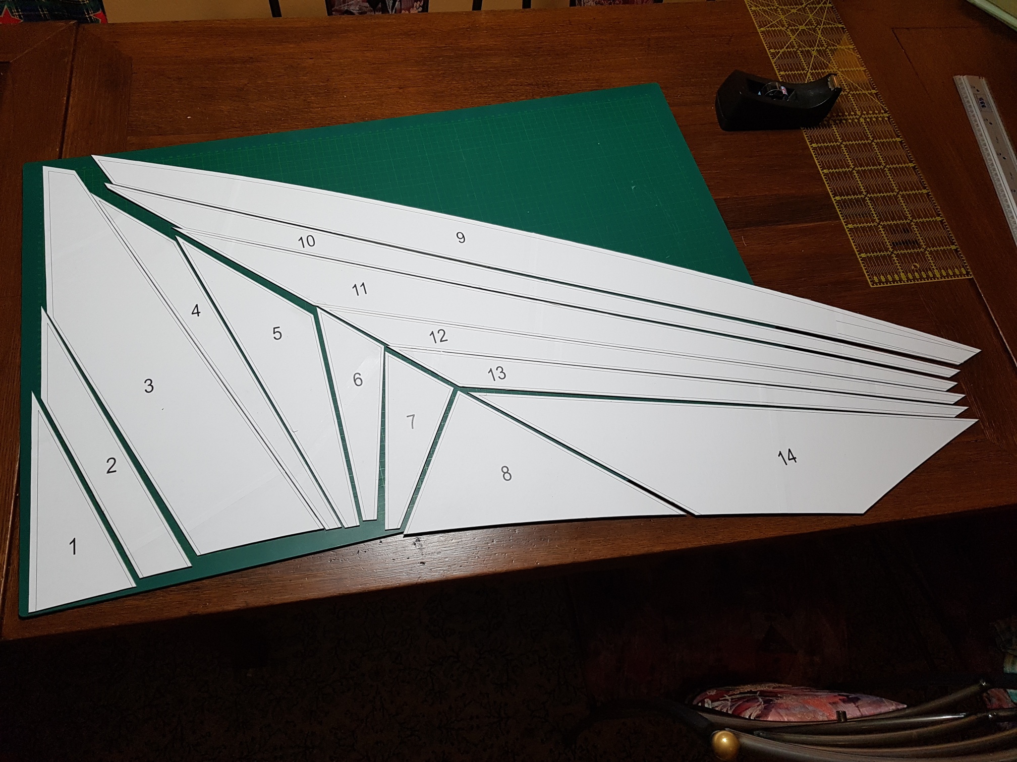 Hieraus habe ich dann, ebenfalls in CorelDraw, ein Schnittmuster destilliert, in A3 ausgedruckt, mit Tesafilm aneinandergestückelt, und mit Sprühkleber auf 2mm Graupappe aufgeklebt:
