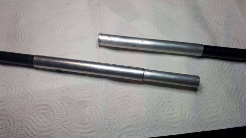 Zunächst habe ich das 18 Rohr zur Hälfte auf den CFK Stab geklebt, und zwar auf beide Enden. Dann auf einem Ende das 14er Alurohr auch wieder zur Hälfte eingeklebt. So steckt jetzt nur Alu in Alu und nicht CFK in Alu. Sollte sich da dann Sand ansammeln, muss ich nicht mehr am CFK Rohr drehen, sondern kann an beide Aluhülsen fassen und dort drehen. So bricht mir der CFK Stab nicht mehr.