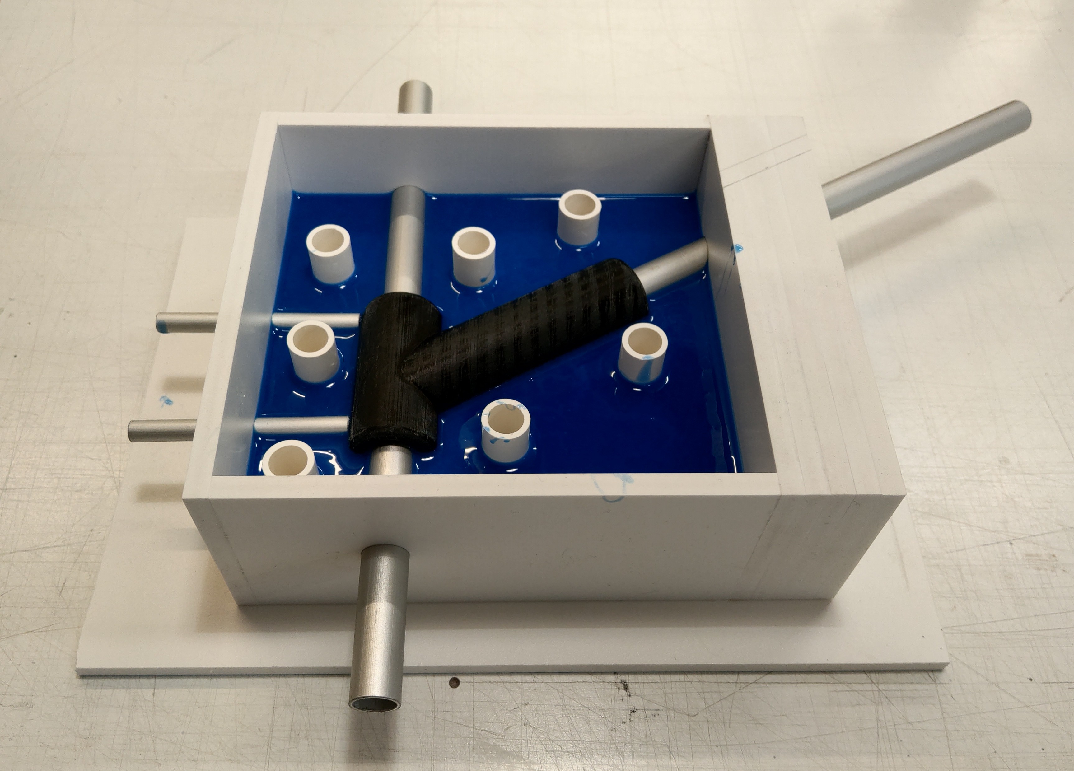 Nach dem aushärten beider Formteile kann die obere Formhälfte entfernt und der gedruckte Verbinder mit allen Stäben für Verbinderöffnungen und die Gusslöcher aus der Form gefischt werden.