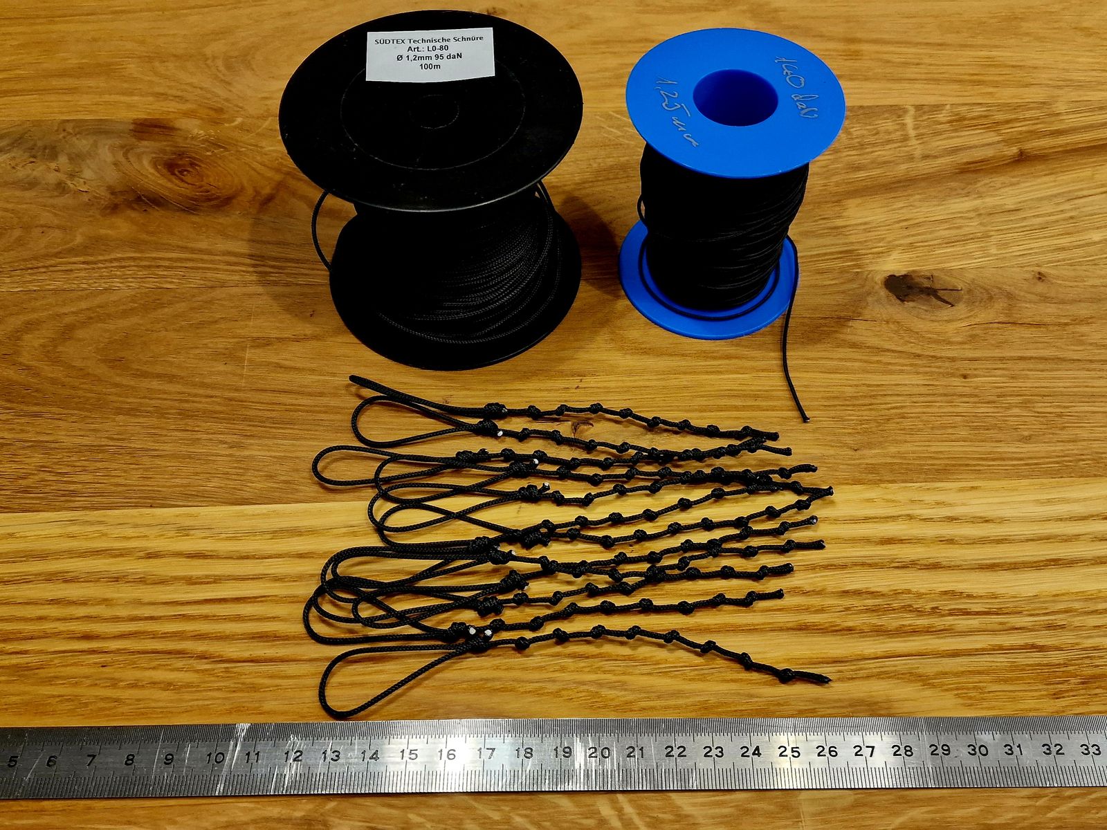 Waageschnüre sind allesammt 1,2mm 140 daN Dyneema. Ausser der kleinste, der hat dünneres 60iger verpasst bekommen.
