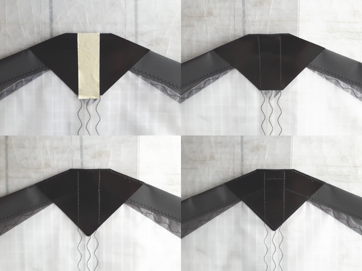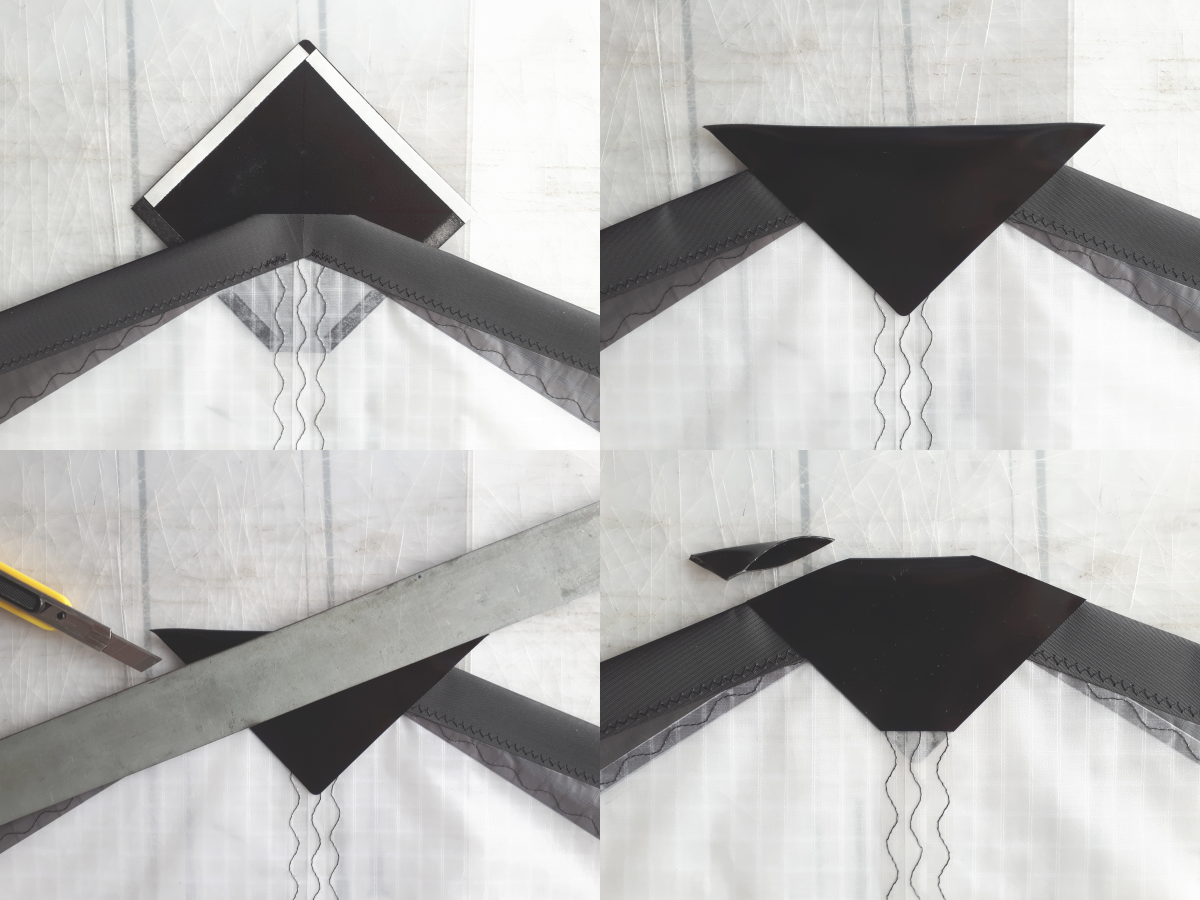So sieht ein Set von Teilen aus, die ich an einem Segel benötige: Heck, Scheuerschutz für obere Spreize, Nase, und Kreuz