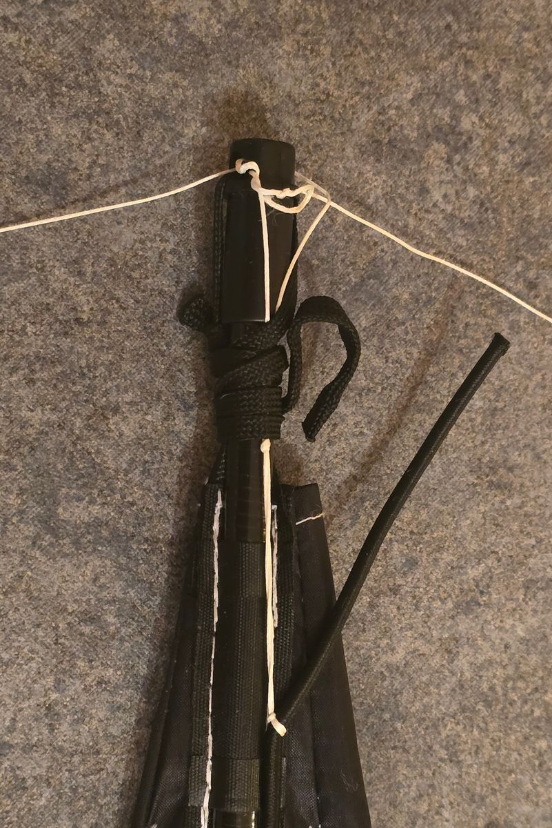 Meine Version entspricht nicht genau der Anleitung. Wenn Du Dir das erste Bild anschaust, siehtst Du, dass die V-Support Lines nicht fest mit der Endkappe verknotet, sondern nur durch die Endkappe geführt sind. Sie sind an einem Gummiband gebuchtet, das am Spine befestigt sind. Ist mir gerade erst aufgefallen. Ich denke, ich kann das Problem mit den lockeren V-Support Lines lösen, indem ich diese auf besagtem Gummiband verschiebe.
