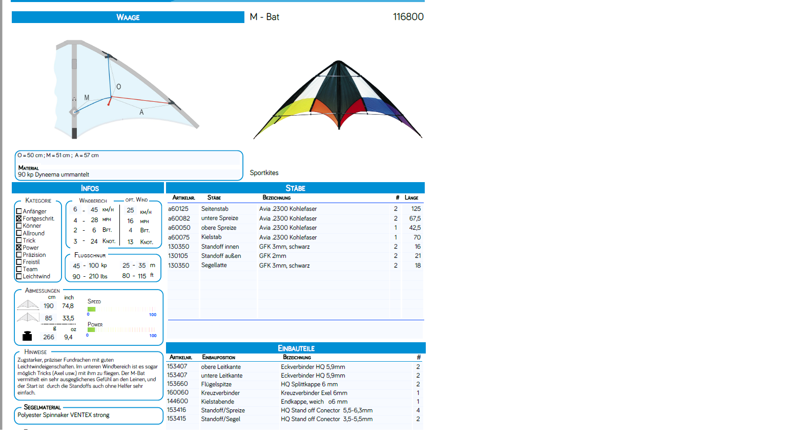 Dann bräuchten wir noch Zubehör: Da die Schlaufen, die bei den Drachen dabei sind, nicht besonders bequem sind, suchen wir nach guten Schlaufen. Dann benötigen wir neue Schnüre, wenigstens für den Dubbel. Bei dem M-Bat ist uns gerade aufgefallen, dass eine Stange fehlt. Als letztes suchen wir nach etwas, mit dem wir den aufgebauten Drachen am Boden halten können (z.B.: Pflöcke).