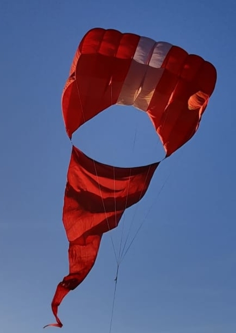 Ich habe mir gebraucht eine grosse Flowform inkl. Bannerschwanz zugelegt. Die Flow hat die Grösse 4m x 5m, 8 Zellen und 5 Kiele. Beim heutigen Erstflug habe ich festgestellt das die Gute massiv nach rechts zieht.