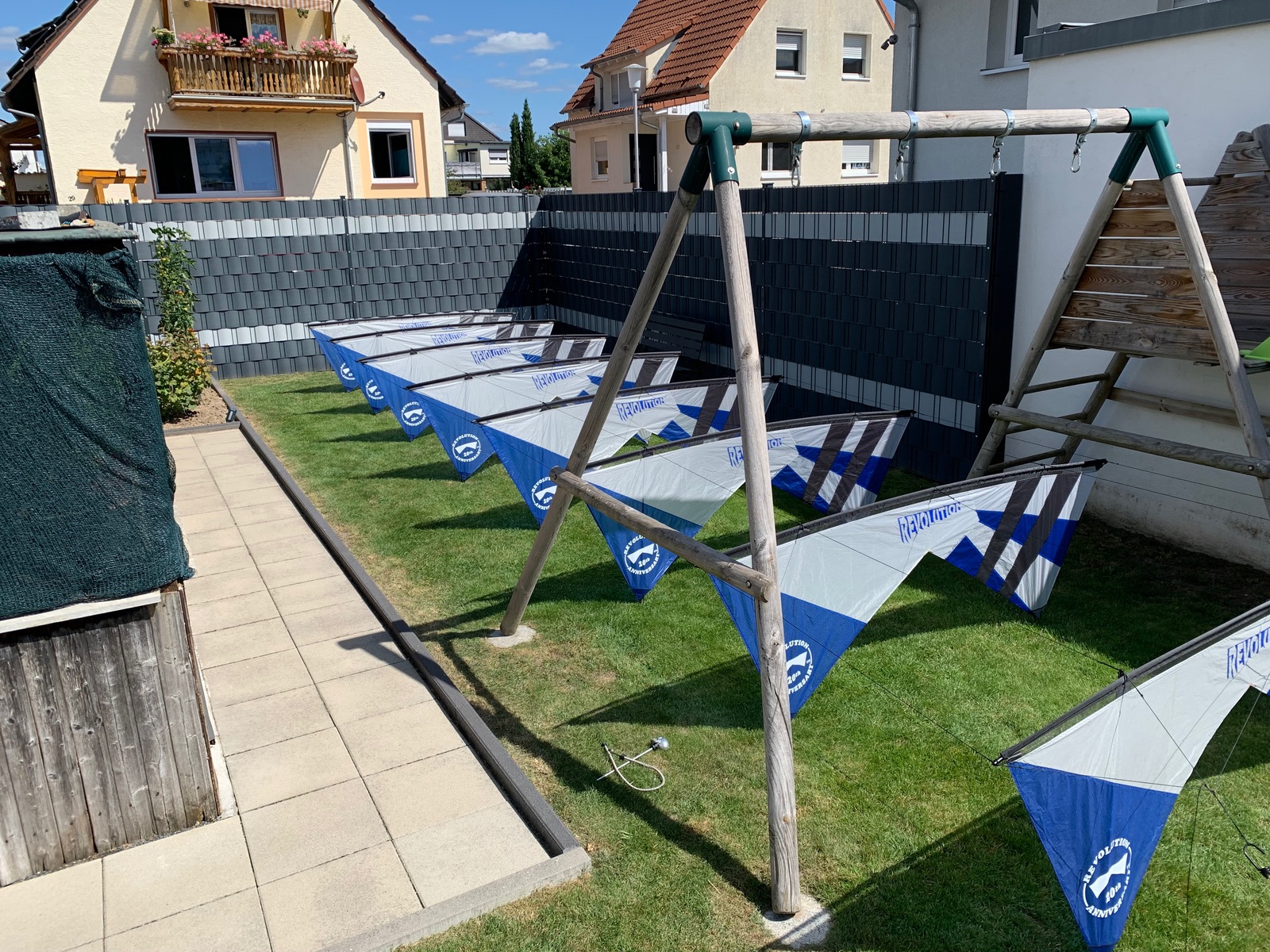 die Koppelleinen nicht vergessen... zwischen jeden Kite 7 Leinen, das ganze mal 9 Lücken macht 63 Leinen. Irgendwann konnte ich keine Knoten mehr sehen