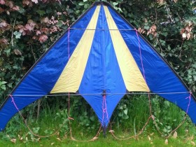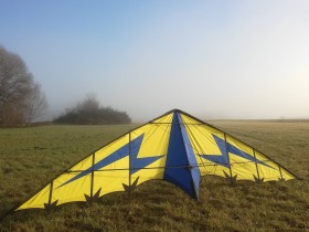 Zum Fliegen werde ich den hier dieses We zwar nicht bringen, da wir Flaute haben, und ich keinen Bock habe zu rennen, aber dafür hier erstmal ein Kellerbild von meinem ersten ordentlich fliegendem Lenkdrachen , den ich 96 bei Karstadt gekauft habe, und damit das Fliegen ( Lenken) gelernt habe.