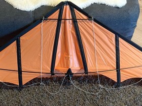 Ich würde ganz vorsichtig behaupten, dass dieser Drachen überhaupt nicht richtig zusammengebaut ist. Es sieht aus als ob die innersten Segellatten mit den unteren Querspreizen verbunden sind, welche wiederum viel zu kurz sind.