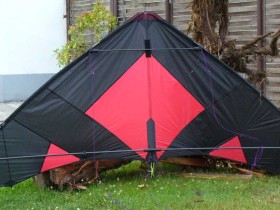 Nach viel Überlegen und kritischer Einschätzung der eigenen Möglichkeiten trenne ich mich von den sehr zugstarken Drachen. Die weiter oben im Foto stehende Pure XL (schwarz-rot) ist ein Eigenbau als SUL und unverkäuflich. Also ich mag immer noch Großdrachen, aber heute ohne diese brachiale Power. Mein großer 3XL (Foto oben) hat zwar 5,50 m Spannweite und ist 2,20 m hoch, er basiert aber teilweise auf dem Eolo Over von 2006, also auch kein Drachen, der fetten Zug aufbaut und locker freistehend bei 3 Bft geflogen werden kann. Beide Drachen sind sehr präzise zu lenken und einfach zu fliegen ….. und deswegen natürlich unverkäuflich.