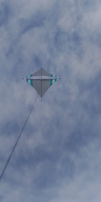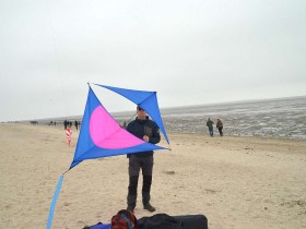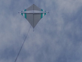 Wie auch in der Bauanleitung beschrieben fliegt der Drachen stabiler mit einem Flachschwanz (4-5m), bei stabilem Wind geht es aber auch ohne. Er ist für leichten Wind gedacht, kommt mit einer 30-45 kp-Leine aus und kommt auch mit wechselnden Windrichtungen gut klar.