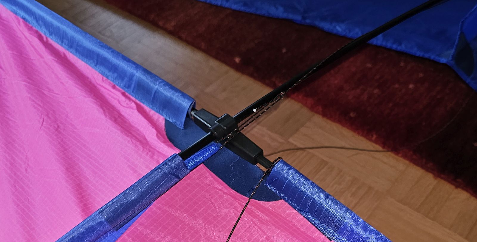 Abweichend vom Plan habe ich einen 6mm Kreuzverbinder aus dem Lenkdrachensortiment für die Kreuzung von Längs- und Querstab verwendet, unterstützt durch einen Stopperclip, damit der Verbinder nicht auf dem Kielstab verrutscht. Auch für die Sicherung der zwei Waagepunkte habe ich Stopperclips verwendet. Die Enden des Querstabs müssen unbedingt mit Splitkappen gebaut werden, beim Längsstab ist es Geschmacksache, wie man die Stabenden gestaltet.