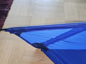 Die Außenkanten habe ich mit Spi-Saumband und Saumfuß eingefasst, die Taschen für den Kielstab aus dem Segelstoff (40g Spi) hergestellt mit Verstärkungen aus selbstklebendem Dacron (Nummerntuch) an den Enden und an allen Ausschnitten, das gleiche gilt auch für die Tasche des Querstabs.
