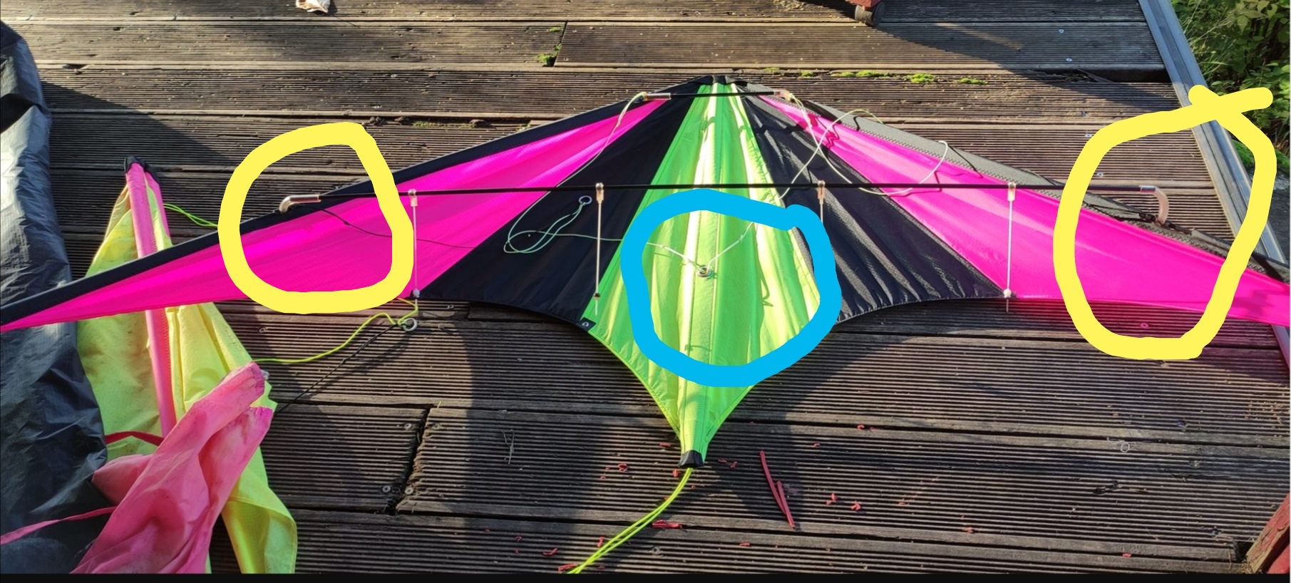 Die untere Querstange (108 cm lang) hat 4 Aufnahmen für Abstandhalter (keine Ahnung ob das heißt). Wenn ich nun die 4 kurzen Streben in die Aufnahmen und im Drachen in die Ösen stecke, fallen die mittleren Streben durch die Spannung der äußeren Streben immer wieder raus.