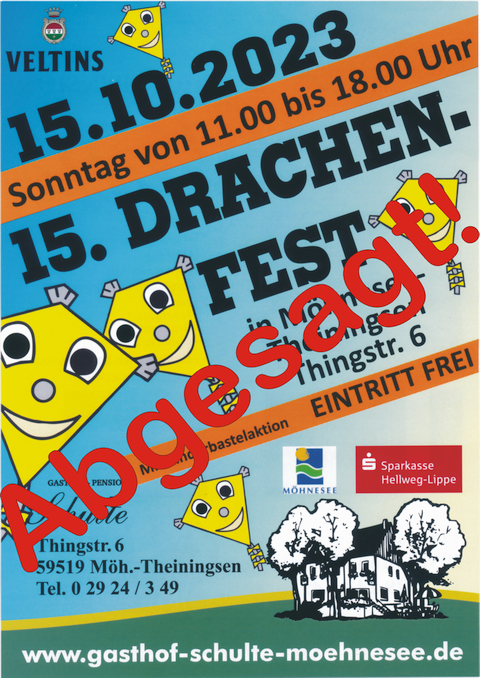 14. Oktober 2023 #3 Hallo zusammen!Vor einigen Minuten erhielt ich die Information, dass das Drachenfest Möhnesee abgesagt wurde.Ich habe das geprüft, und leider die Bestätigung erhalten:Das Drachenfest findet NICHT statt!Schade, schade...Gruß,Karsten