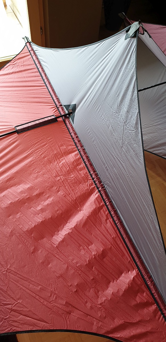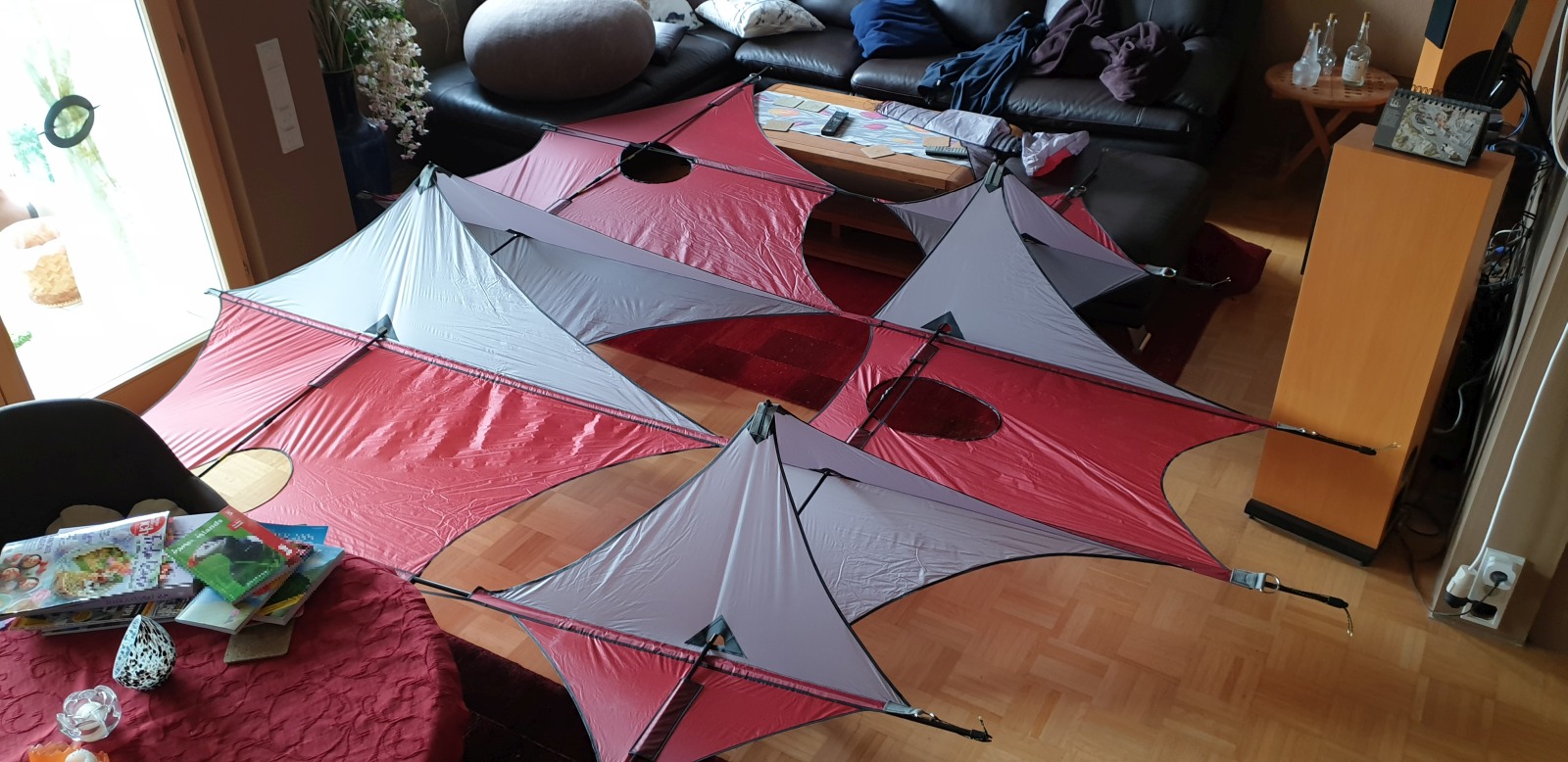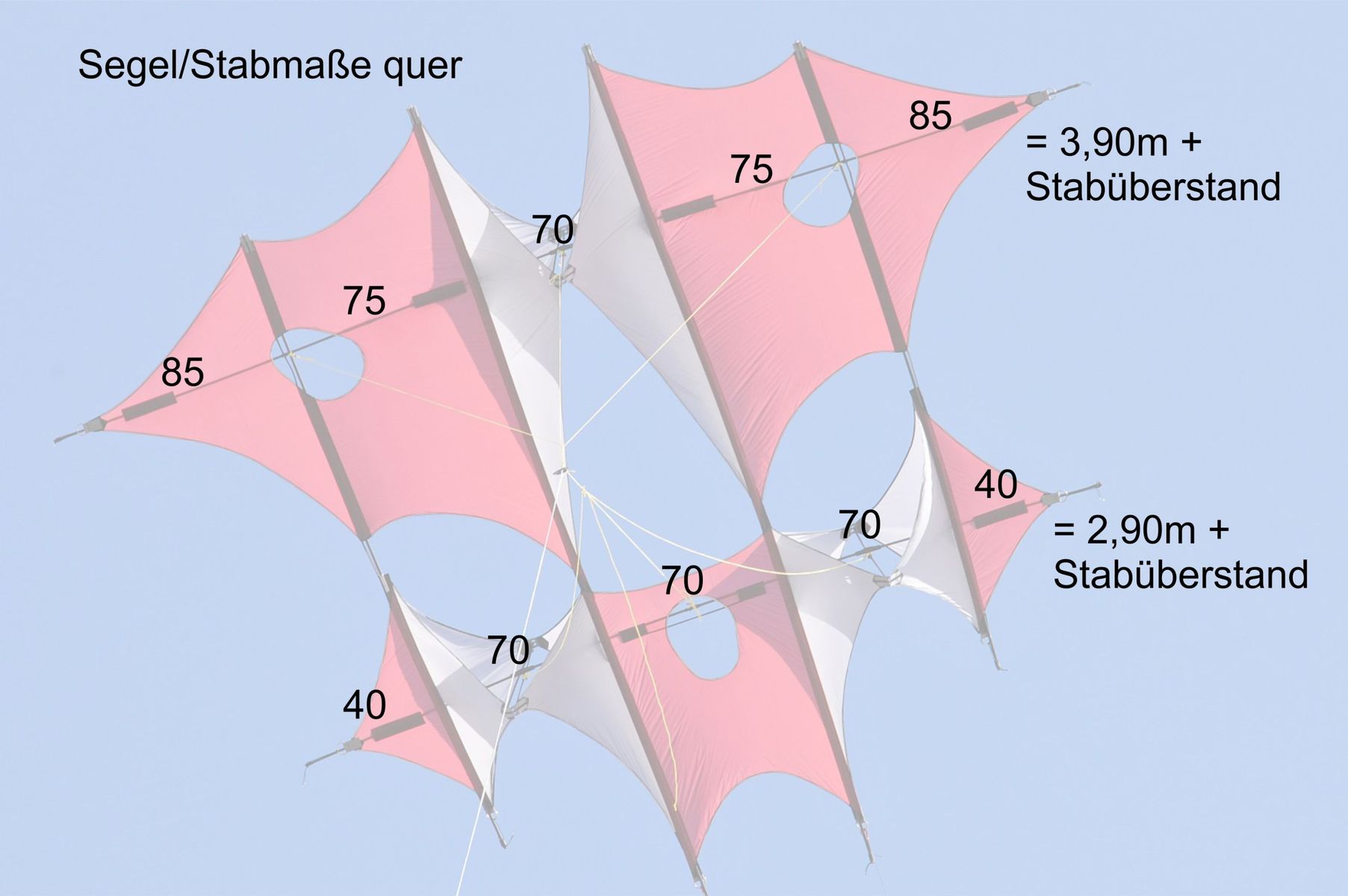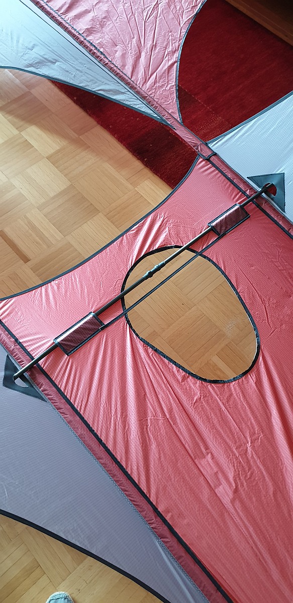 Die 3 Lynnbox-Zellen sind also ca. 70cm breit, ca. 80cm von Spitze zu Spitze und die Segeldreiecke von der Längsstange zu Spitze der Zelle messen ca. 53cm (Höhe des Dreiecks).